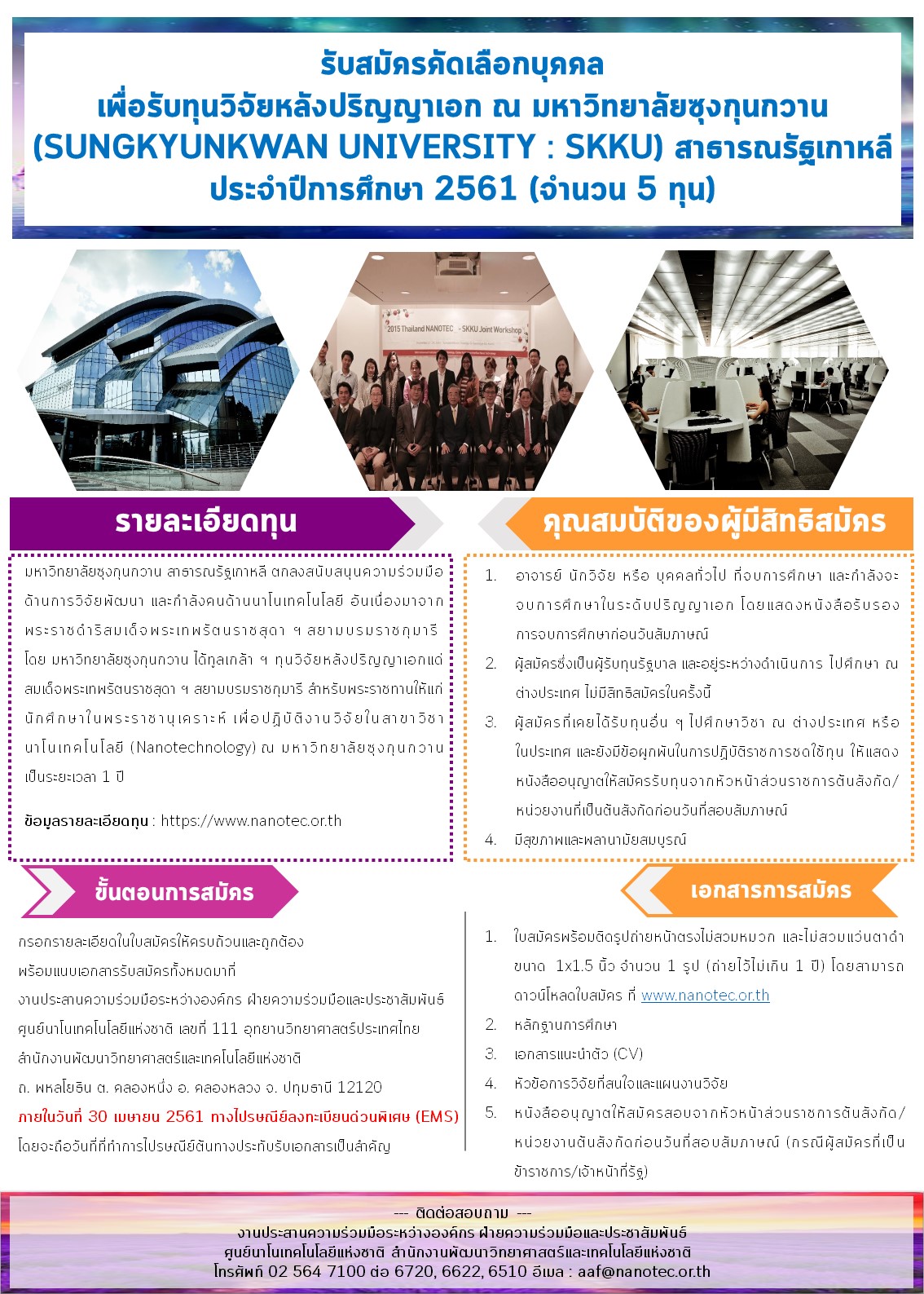 เพื่อปฏิบัติงานวิจัยในสาขาวิชานาโนเทคโนโลยี (Nanotechnology) ณ มหาวิทยาลัยซุงกุนกวาน เป็นระยะเวลา 1 ปี