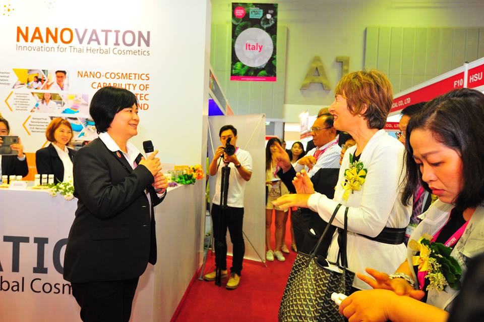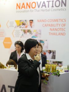 นอกจากนี้ ดร.ภาวดี อังค์วัฒนะ รองผู้อำนวยการนาโนเทค ยังได้ร่วมการปาฐกถาพิเศษในหัวข้อ “Applications of Nano Technology in Cosmetic production” ซึ่งได้กล่าวถึงบทบาทการเป็นหน่วยงานของรัฐที่ร่วมสนับสนุนในการนำศักยภาพด้านการวิจัยมาพัฒนาพืขสมุนไพรให้สามารถใช้ประโยชน์ได้อย่างมีประสิทธิภาพ เพื่อให้เป็นที่ยอมรับและสร้างมูลค่าเพิ่มให้แก่ผลิตภัณฑ์แปรรูปจากสมุนไพร ตามแผนแม่บทแห่งชาติว่าด้วยการพัฒนาสมุนไพรไทย ฉบับที่ 1 พ.ศ. 2560-2564 นอกจากนี้ยังเป็นการส่งเสริมให้เกิดกลไลการสนับสนุนผู้ประกอบการในกลุ่มธุรกิจแปรรูปสมุนไพรให้สามารถส่งออกได้ในตลาดโลก โดยนาโนเทค สวทช. จะเข้ามามีบทบาทในการนำองค์ความรู้ทางด้านวิทยาศาสตร์ เทคโนโลยีและนวัตกรรม มาช่วยยกระดับผลิตภัณฑ์ ไม่ว่าจะเป็น การใช้เทคโนโลยีการกักเก็บ (Nano-encapsulation) ในการนำส่งสารสกัดสมุนไพรซึ่งกักเก็บอยู่ในรูปแบบอนุภาคนาโนไปยังจุดเป้าหมายเพื่อให้สามารถออกฤทธิ์ได้อย่างมีประสิทธิภาพ เทคโนโลยีการสกัดที่เป็นมิตรต่อสิ่งแวดล้อม (Green Extraction) และการพัฒนาสูตรตำรับ (Formulation) เทคนิคการวิเคราะห์ทดสอบทางนาโนเทคโนโลยีด้วยเครื่องมือที่ทันสมัยโดยศูนยวิเคราะห์ทางนาโนเทคโนโลยีขั้นสูง (National Advanced Nano-Characterization Center) รวมถึงการขยายขนาดการผลิตจากในระดับห้องปฏิบัติการไปสู่โรงงานผลิตเครื่องสำอางต้นแบบที่ได้รับการรับรองตามมาตรฐาน GMP (Cosmetic Production Pilot Plant) ทั้งนี้ เพื่อส่งเสริมให้ผู้ประกอบการไทยสามารถนำผลิตภัณฑ์อุตสาหกรรมสารสกัดและผลิตภัณฑ์จากสมุนไพรและเพิ่มขีดความสามารถการแข่งขันผลิตภัณฑ์สมุนไพรไทยในเวทีโลก