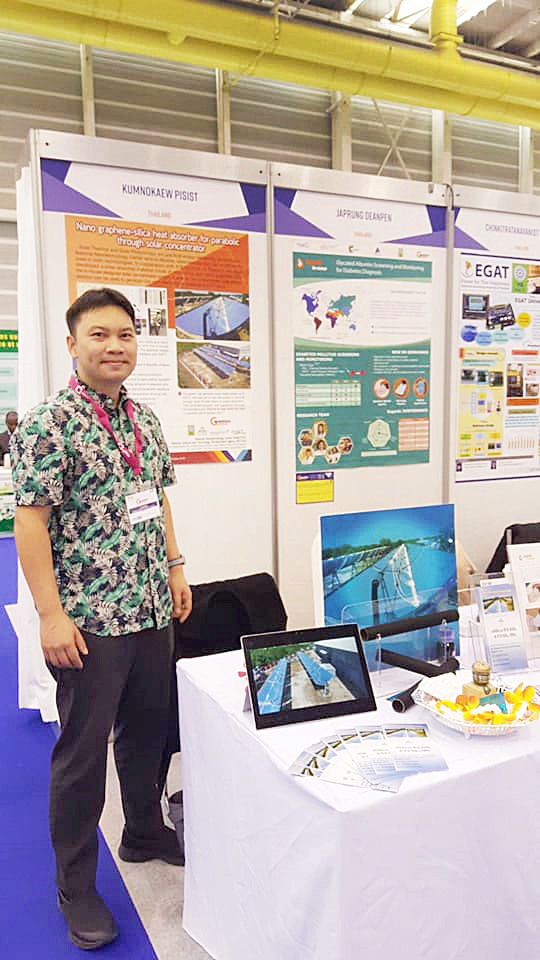 ผลงานวิจัยสารเคลือบผิวจากอนุภาคนาโนกราฟีนและนาโนซิลิกา สำหรับดูดซับพลังงานจากการรวมแสงอาทิตย์ที่ทนทานต่อสภาวะความร้อนสูงมากกว่า ๕๐๐ oC และมีความยึดเกาะสูง ทนต่อยึดหดจากความร้อนของพื้นผิวโลหะ นอกจากนี้ยังสามารถเตรียมได้จากกระบวนการแบบ wet process และขยายกำลังการผลิตได้ ทดแทนกระบวนการเคลือบแบบสุญญากาศขั้นสูงที่ต้องใช้เทคโนโลยีจากต่างประเทศ สารเคลือบดังกล่าว ถูกนำไปใช้บนแผงผลิตพลังงานรวมจากแสงอาทิตย์แบบพาราโบลิคของบริษัท เอ ที อี จำกัด อำเภอบางปะกง จังหวัดฉะเชิงเทรา เพื่อผลิตไอน้ำที่ความร้อน ๔๕๐ oC ที่ความดัน ๓๐ บาร์ ตั้งแต่เดือน มกราคม ๒๕๖๐ ที่ผ่านมา