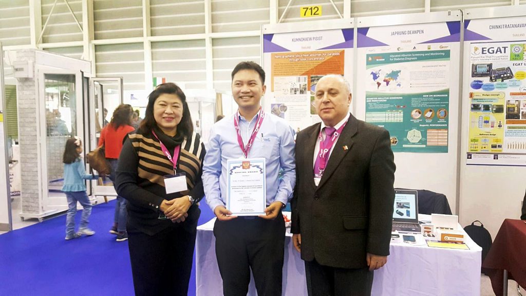 ดร. เดือนเพ็ญ จาปรุง, ดร. ขุนเสก เสกขุนทด, คุณปรีดี ปิ่นประดับ, น.ส ชยาชล อภิวาท, น.ส เกียรตินิดา ตรีรัตน์ตระกูล และ น.ส วิรียา เชาว์จิรพันธุ์ กลุ่มวิจัยวัสดุตอบสนองและเซ็นเซอร์ระดับนาโน กลุ่มวิจัยวัสดุตอบสนองและเซ็นเซอร์ระดับนาโน ได้รับรางวัลเหรียญเงิน( MEDALLE D’OR SILVER MEDAL) จากผลงานชุดตรวจวัดปริมาณโปรตีนไกลเคทเตดอัลบูมินเพื่อติดตามเบาหวาน “SugarAL GO sensor” Glycated Albumin Screening and monitoring for diabetes diagnosis