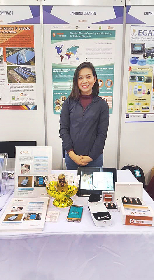 ผลงานวิจัย “SugarAL GO sensor” เป็นชุดตรวจคัดกรอง และติดตามภาวะเบาหวานแบบใหม่ที่ไม่จำเป็นต้องอดอาหาร ก่อนการตรวจวัด และสามารถตรวจติดตามภาวะเบาหวานได้ทุก ๑-๒ อาทิตย์ โดยเป็นการประยุกต์ใช้แอปตาเซ็นเซอร์ร่วมกับนาโนเทคโนโลยี ร่วมกับการพัฒนาเครื่องตรวจวัดแบบพกพา ที่เชื่อมต่อกับแอบพลิเคชั่นอย่างง่ายบนโทรศัพท์มือถือ สะดวกต่อการใช้งานโดยบุคลากรทางการแพทย์ และบุคคลทั่วไป โดยผลงานดังกล่าวมีการยื่นจดสิทธิบัตรในประเทศไทยเเล้วจำนวน ๘ ฉบับ และในสหรัฐอเมริกาอีก ๑ ฉบับ”