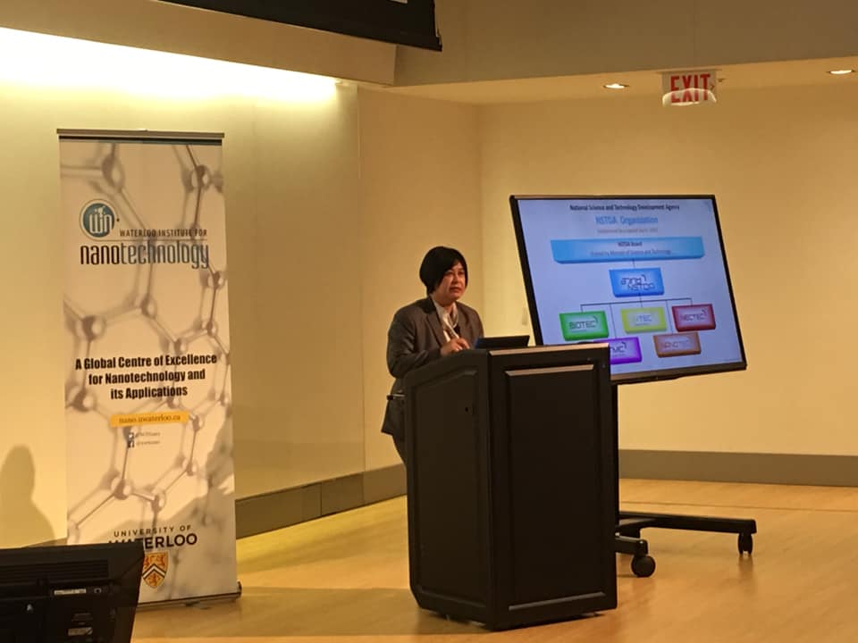 วันที่ 7 มิถุนายน 2562 นาโนเทค สวทช. ร่วมกับ Waterloo Institute for Nanotechnology, University of Waterloo ประเทศแคนาดา ได้จัดพิธีลงนามความร่วมมือ ภายใต้กรอบข้อตกลงการดำเนินกิจกรรมความร่วมมือ อาทิ โครงการวิจัยและพัฒนาที่มีร่วมกัน รวมไปถึงกิจกรรมเพื่อการส่งเสริมและสนับสนุนให้เกิดความเข้มแข็งในด้านความสัมพันธ์ระหว่างประเทศ นอกจากนี้ ดร.ภาวดีฯ ยังได้รับเชิญให้เป็นวิทยากรบรรยายในหัวข้อ “The International Symposium on Frontiers in Nanoscience and Nanotechnology” ในกิจกรรมที่จัดขึ้นโดย Waterloo Institute for Nanotechnology, University of Waterloo โดยการบรรยายครั้งนี้มุ่งเน้นไปที่การสร้างผลกระทบเชิงบวกต่อเศรษฐกิจและสังคมของประเทศด้วยนาโนเทคโนโลยีอีกด้วย