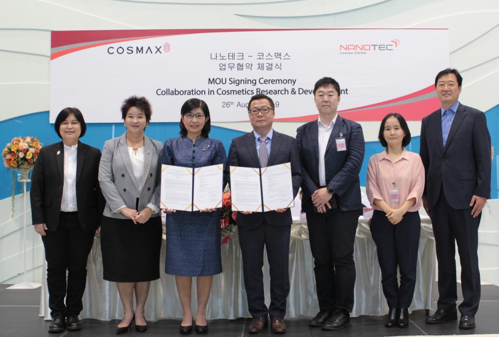 ดร.วรรณี ฉินศิริกุล ผู้อำนวยการศูนย์นาโนเทคโนโลยีแห่งชาติ (นาโนเทค) ร่วมกับนายเมียง ซัม พัค หัวหน้าฝ่ายวิจัยและนวัตกรรมบริษัท ซีโอเอสเอ็มเอเอ็กซ์ จำกัด ประเทศเกาหลีใต้ และคณะผู้บริหาร ลงนามความร่วมมือในการดำเนินงานวิจัยและพัฒนาเวชสำอางระดับอุตสาหกรรมในไทยและต่างประเทศ เพื่อต่อยอดงานวิจัยทางด้านเทคโนโลยีการกักเก็บ หรือนาโนเอ็นแคปซูเลชั่น (Nano-Encapsulation Technology) เพื่อเพิ่มประสิทธิภาพของผลิตภัณฑ์ สร้างมูลค่าและส่งต่อสู่ตลาดอุตสาหกรรมเวชสำอางระดับโลก