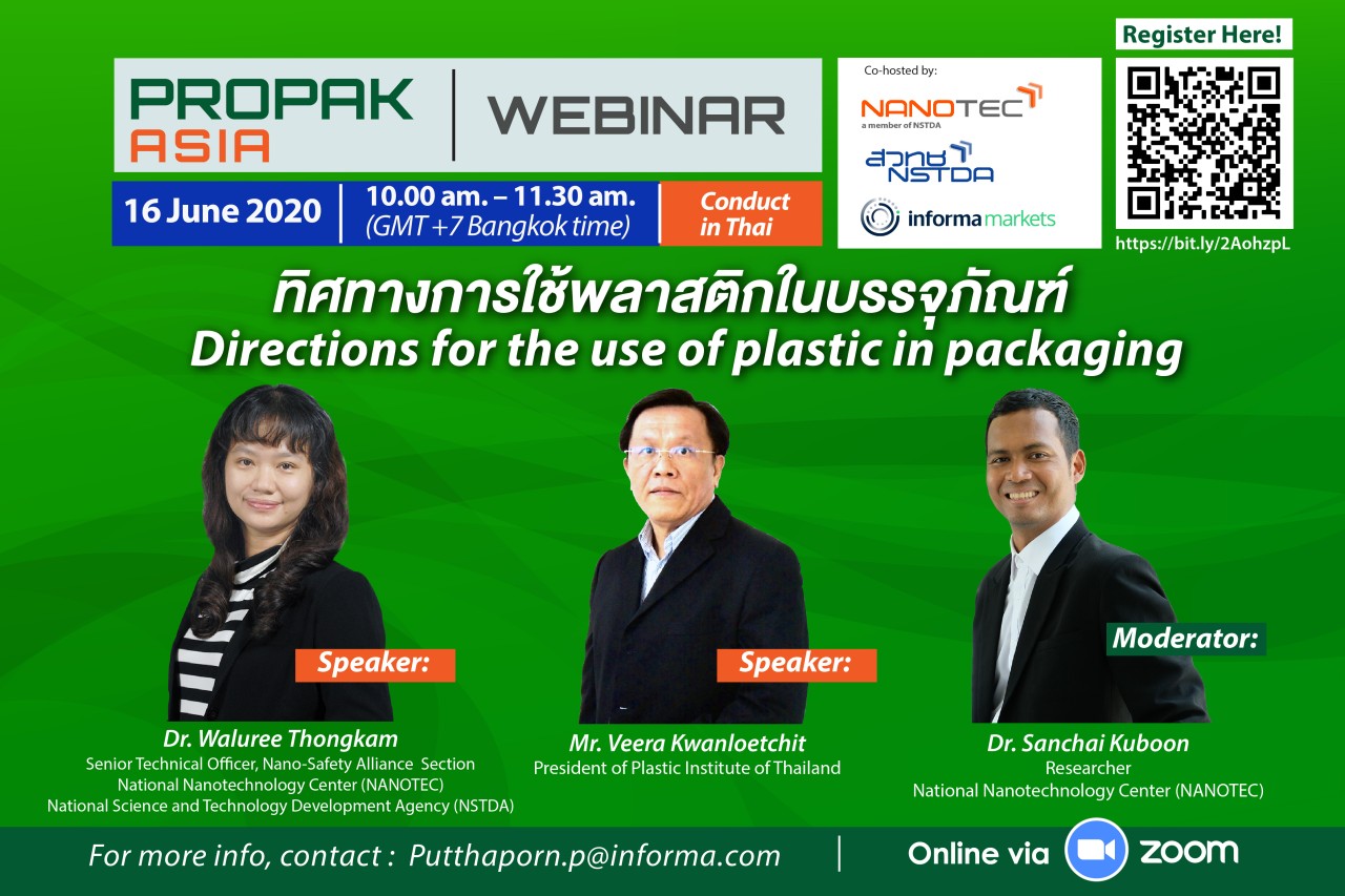 ศูนย์นาโนเทคโนโลยีแห่งชาติ สำนักงานพัฒนาวิทยาศาสตร์และเทคโนโลยีแห่งชาติ (ศน.พว.) ร่วมกับ สภาสมาคมวิทยาศาสตร์และเทคโนโลยีแห่งประเทศไทย (สสวทท.) และ บริษัทอินฟอร์มา มาเก็ตส์ (ประเทศไทย) ผู้จัดงานแสดงสินค้าอุตสาหกรรมและเทคโนโลยีด้านกระบวนการผลิต การแปรรูป และบรรจุภัณฑ์ แห่งภูมิภาคเอเชีย ครั้งที่ 28 (ProPak Asia 2020) จัดสัมมนาในรูปแบบออนไลน์ หัวข้อ “ทิศทางการใช้พลาสติกในบรรจุภัณฑ์” ในวันที่ 16 มิถุนายน 2563 เวลา 10.00-11.30 น.