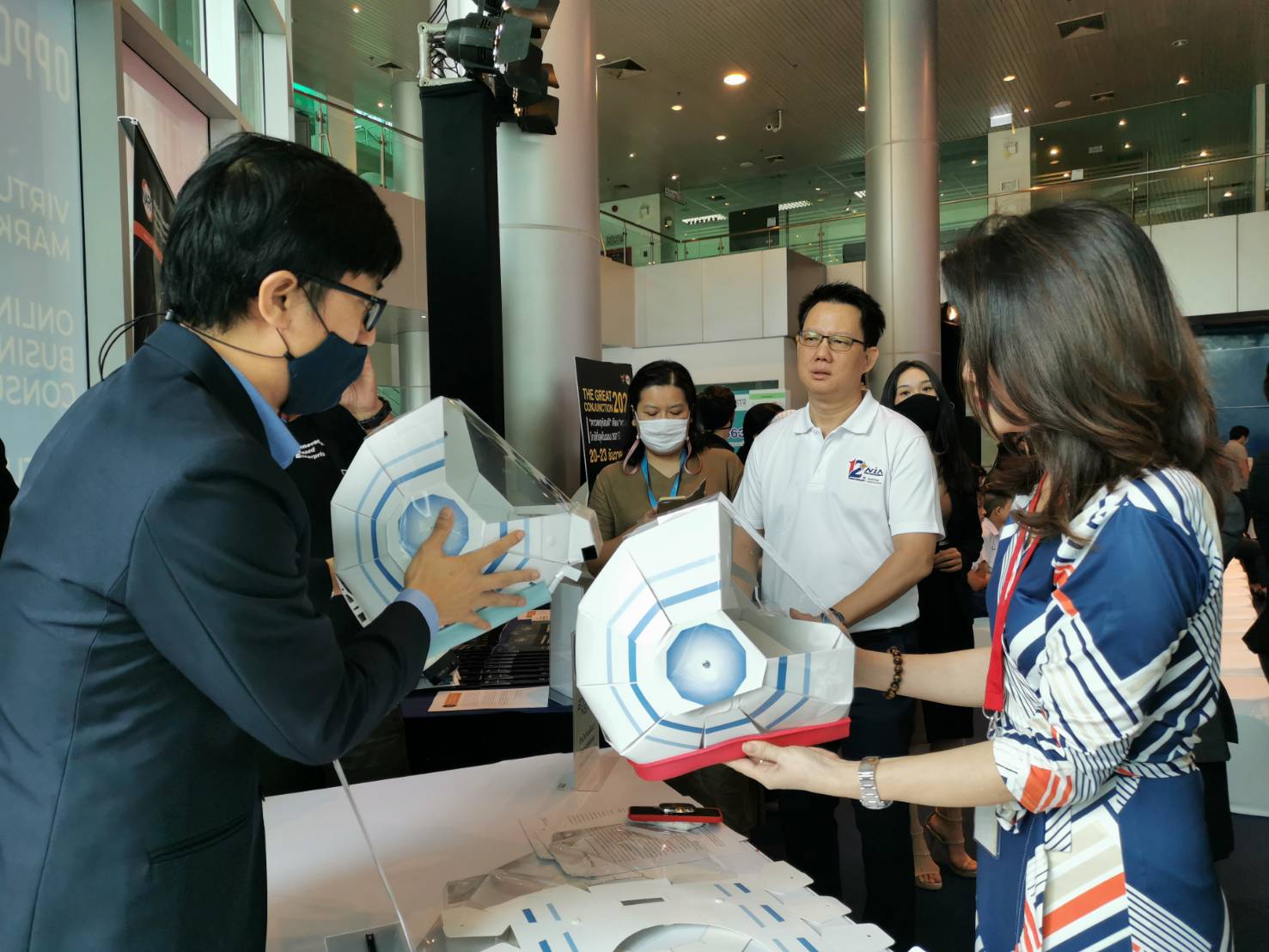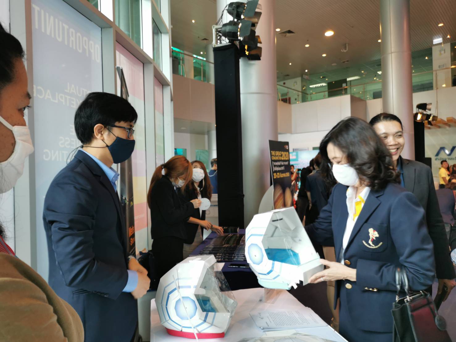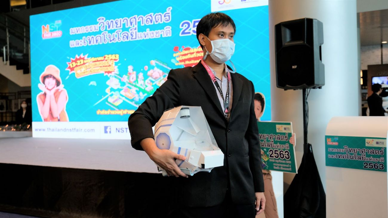 นาโนเทค สวทช. อว. นำโดย ดร.ธิติกร บุญคุ้ม และดร.กิตติพงษ์ ตันติสันติสม นักวิจัยจากห้องปฏิบัติการทีมวิจัยเข็มระดับนาโน กลุ่มวิจัยวัสดุตอบสนองและเซ็นเซอร์ระดับนาโน ศูนย์นาโนเทคโนโลยีแห่งชาติ (ศน.) สำนักงานพัฒนาวิทยาศาสตร์และเทคโนโลยีแห่งชาติ (สวทช.) กระทรวงการอุดมศึกษา วิทยาศาสตร์ วิจัย และนวัตกรรม (อว.) นำผลงาน “หมวกแรงดันลบ” นวัตกรรมเพื่อลดการแพร่กระจายเชื้อจากกลุ่มเฝ้าระวัง อวดโฉมในงาน “มหกรรมวิทยาศาสตร์และเทคโนโลยีแห่งชาติ ประจำปี 2563” โดยมี ศาสตราจารย์พิเศษ ดร.เอนก เหล่าธรรมทัศน์ รัฐมนตรีว่าการกระทรวงการอุดมศึกษา วิทยาศาสตร์ วิจัยและนวัตกรรม (อว.) เป็นประธานเปิดงาน