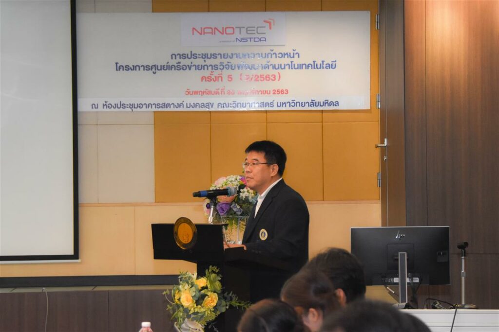 เมื่อวันที่ 26 พฤศจิกายน 2563 ณ ห้องประชุมอาคารสตางค์ มงคลสุข คณะวิทยาศาสตร์ (พญาไท) มหาวิทยาลัยมหิดล ดร.วรรณี ฉินศิริกุล ผู้อำนวยการศูนย์นาโนเทคโนโลยีแห่งชาติ (นาโนเทค) สำนักงานพัฒนาวิทยาศาสตร์และเทคโนโลยีแห่งชาติ (สวทช.) ผู้บริหาร นักวิจัยนาโนเทคและอาจารย์จากศูนย์เครือข่าย เข้าร่วมการประชุมติดตาม ประเมินผลรายงานความก้าวหน้าการดําเนินงาน โครงการศูนย์เครือข่ายการวิจัยและพัฒนาด้านนาโนเทคโนโลยี (RNN) ครั้งที่ 5 ในครั้งนี้ศูนย์เครือข่ายฯ ม.มหิดล เป็นเจ้าภาพจัดประชุม โดยมี รศ.ดร.ฤทัยวรรณ โต๊ะทอง รองคณบดีฝ่ายวิจัยและวิเทศสัมพันธ์ ในฐานะผู้แทนอธิการบดีมหาวิทยาลัยมหิดล ให้เกียรติกล่าวต้อนรับ และ นางสาวมณีรัตน์ จอมพุก ผู้อำนวยการกองบริหารงานวิจัย กล่าวรายงาน
