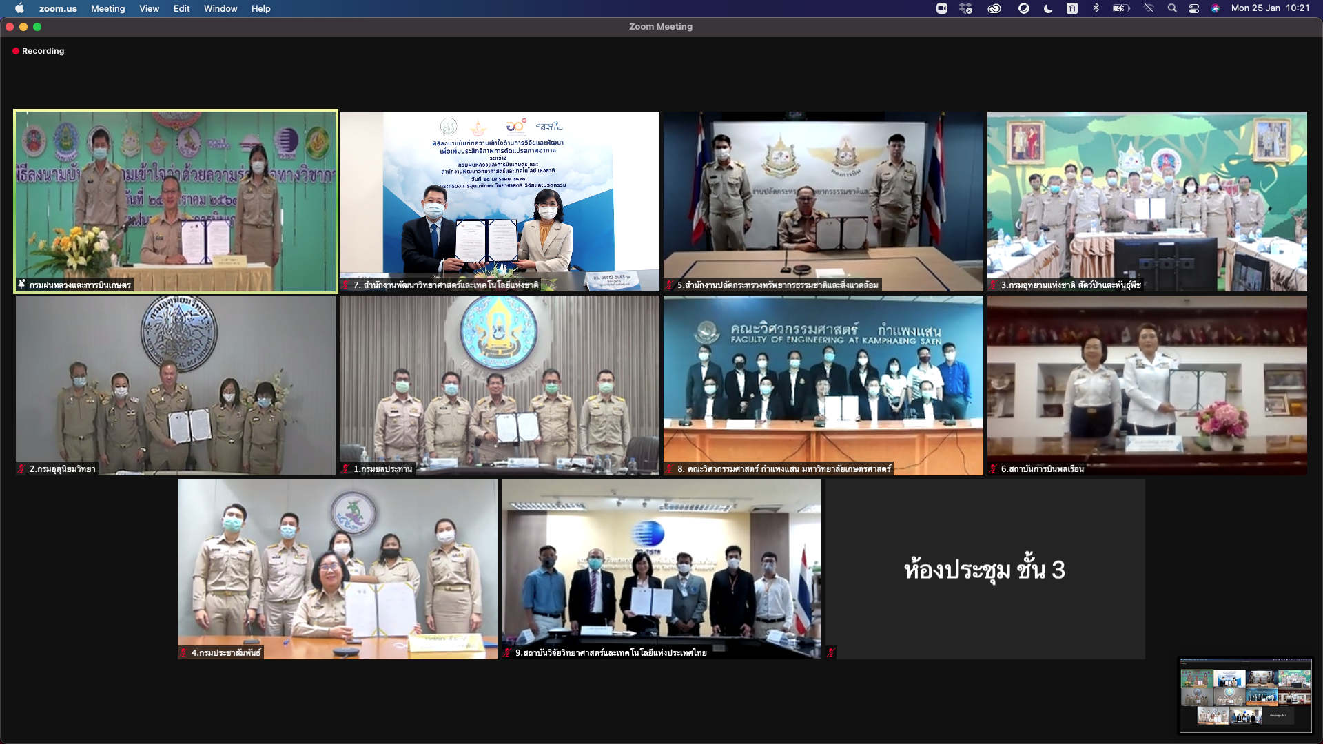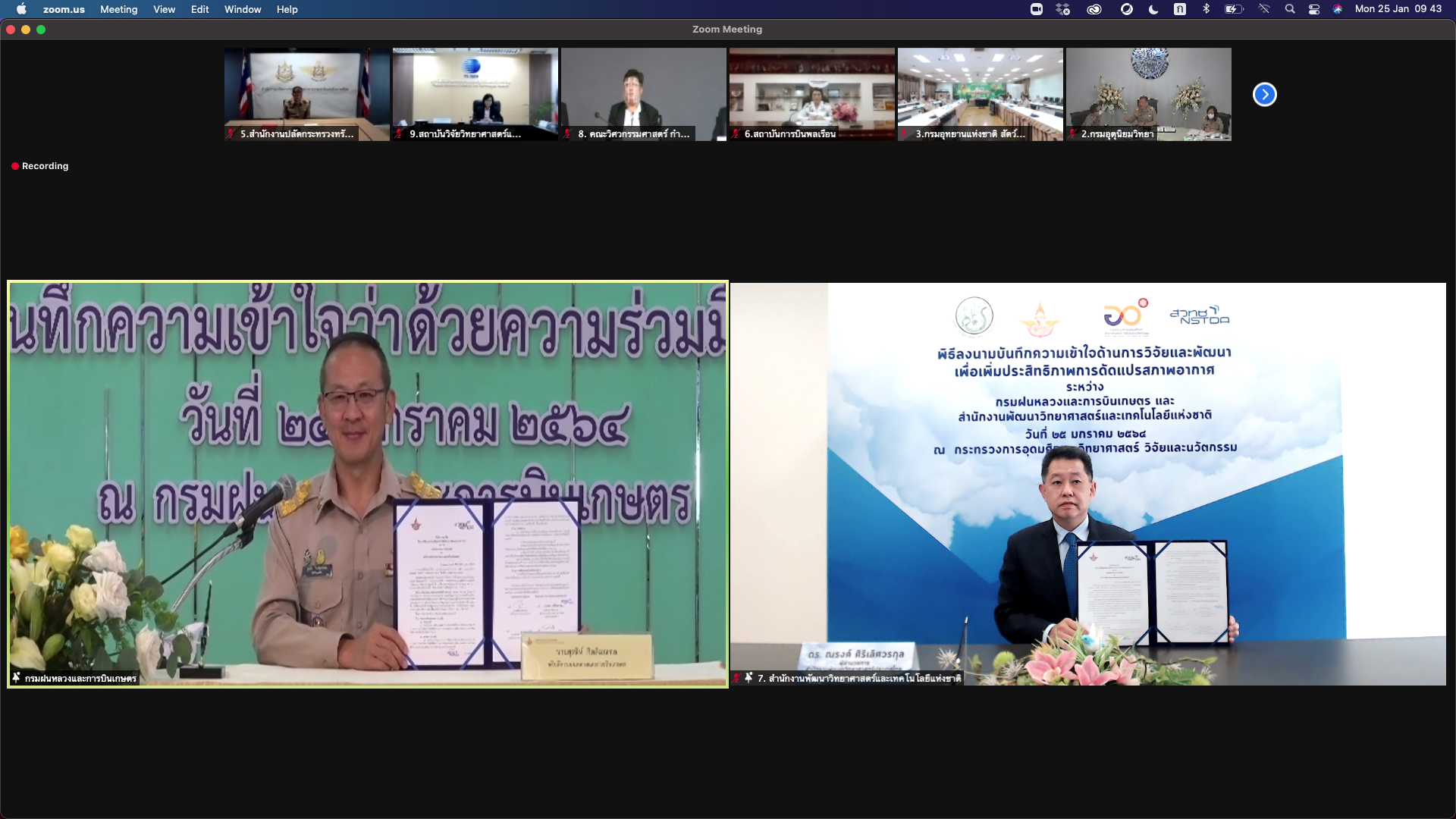 วันนี้ (25 มกราคม 2564) สำนักงานพัฒนาวิทยาศาสตร์และเทคโนโลยีแห่งชาติ (สวทช.) โดยศูนย์นาโนเทคโนโลยีแห่งชาติ (นาโนเทค) ลงนามบันทึกความเข้าใจด้านการวิจัยและพัฒนาเพื่อเพิ่มประสิทธิภาพการดัดแปรสภาพอากาศ ในรูปแบบเสมือนจริง (Virtual MOU Signing Ceremony) ผ่านระบบ Zoom กับกรมฝนหลวงและการบินเกษตร กระทรวงเกษตรและสหกรณ์ โดยมีนายสุรสีห์  กิตติมณฑล อธิบดีกรมฝนหลวงและการบินเกษตร, ดร.ณรงค์ ศิริเลิศวรกุล ผู้อำนวยการ สวทช. และ ดร.วรรณี ฉินศิริกุล ผู้อำนวยการนาโนเทค ร่วมลงนาม