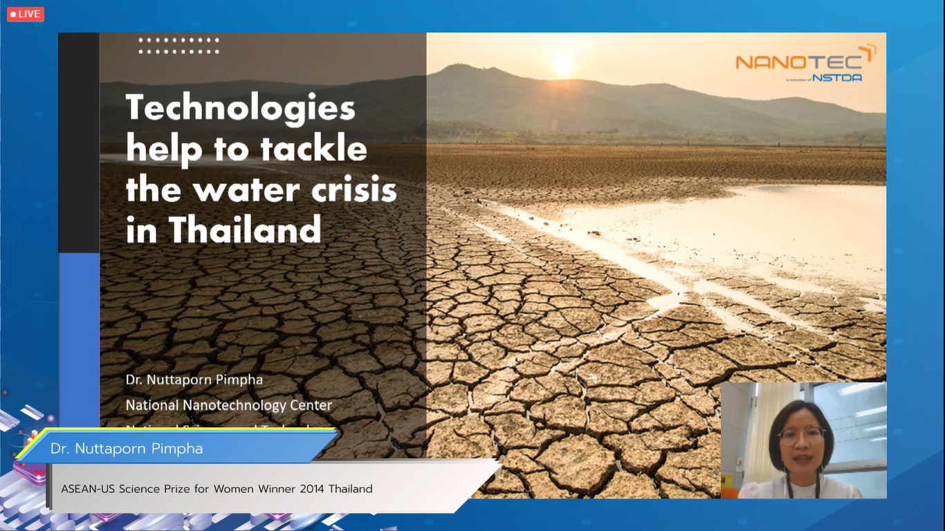 (14 มิถุนายน 2564) ดร.ณัฏฐพร พิมพะ นักวิจัยอาวุโสและหัวหน้าทีมวิจัยนาโนเทคโนโลยีเพื่อสิ่งเเวดล้อม กลุ่มวิจัยวัสดุผสมและการเคลือบนาโน นาโนเทค ได้รับเชิญให้บรรยายในเรื่อง “การใช้เทคโนโลยีในการรับมือกับวิกฤตน้ำในประเทศไทย” ในงานประชุมนักวิทยาศาสตร์สตรี ซึ่งเป็นส่วนหนึ่งของงานสัปดาห์วิทยาศาสตร์อาเซียนครั้งที่ 11 (The 11th ASEAN Science, Technology and Innovation Week: ASTIW-11)