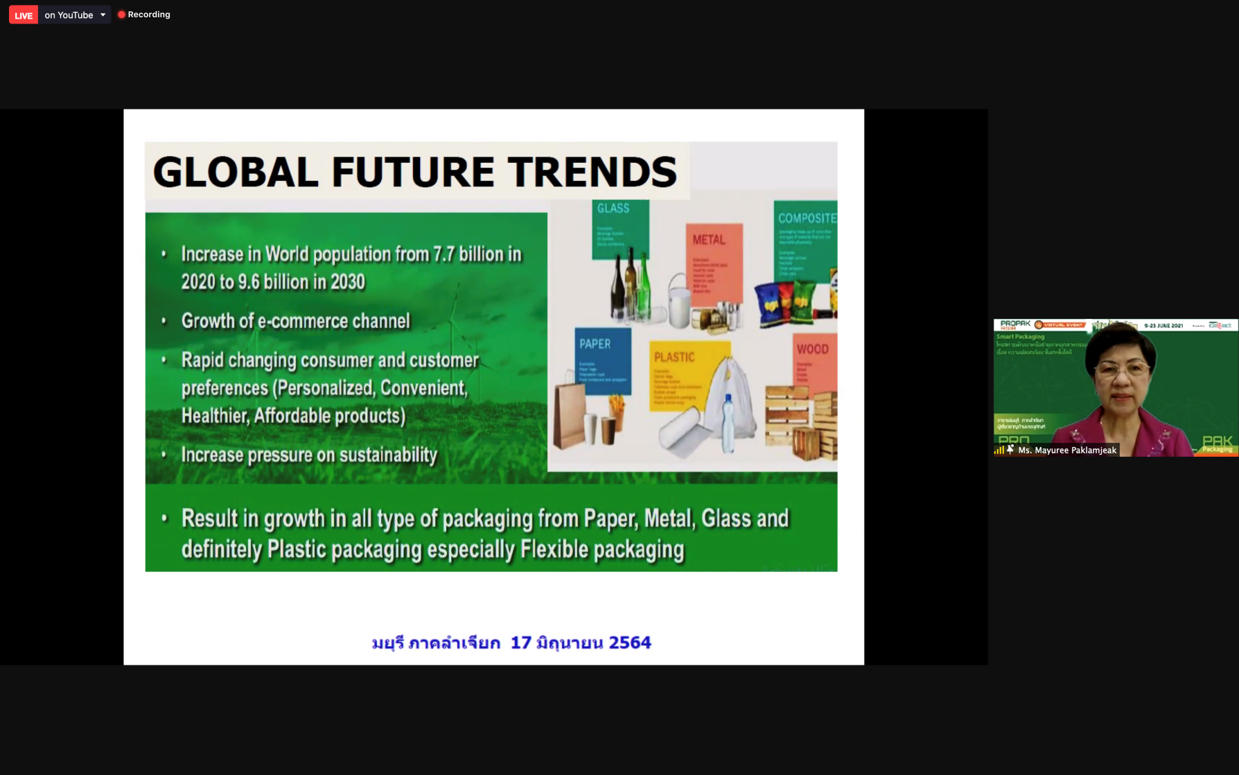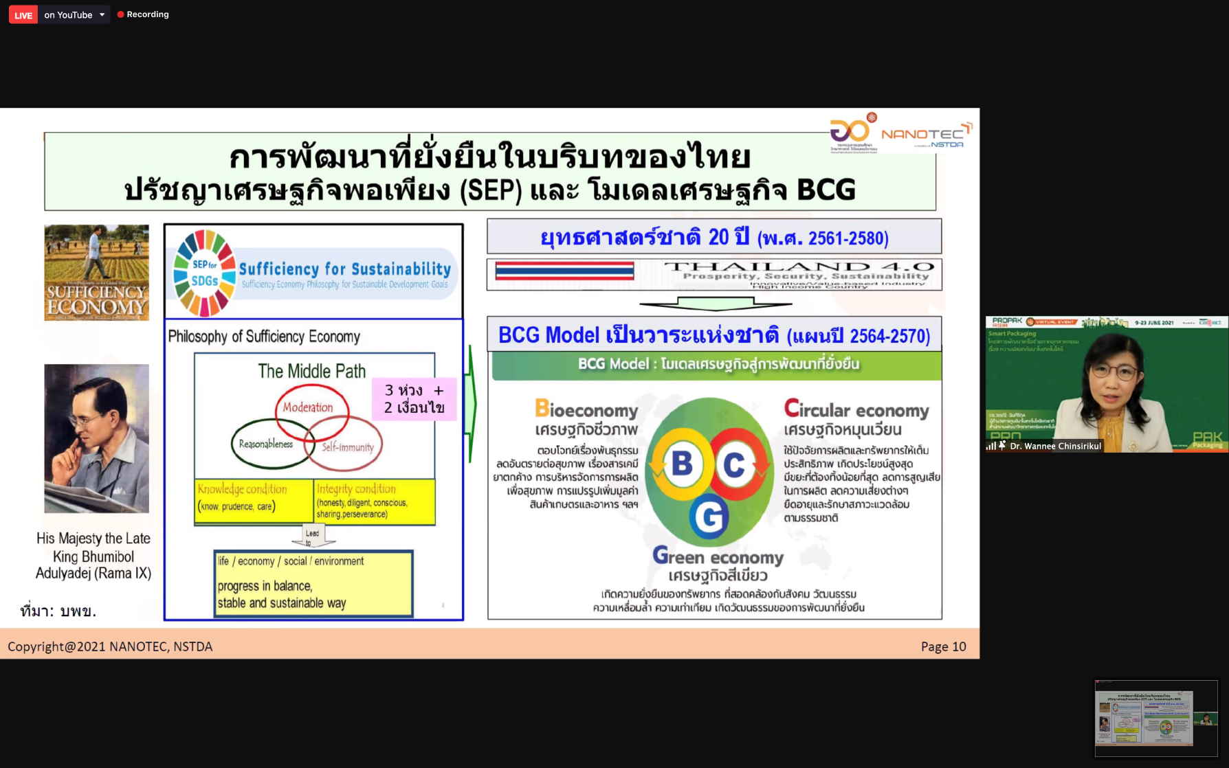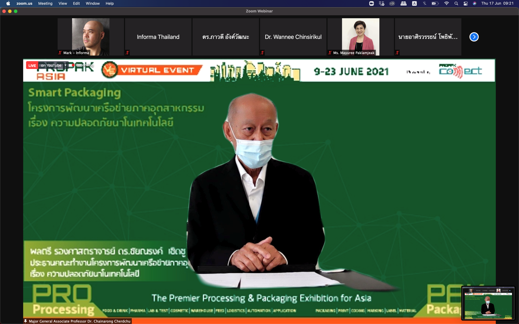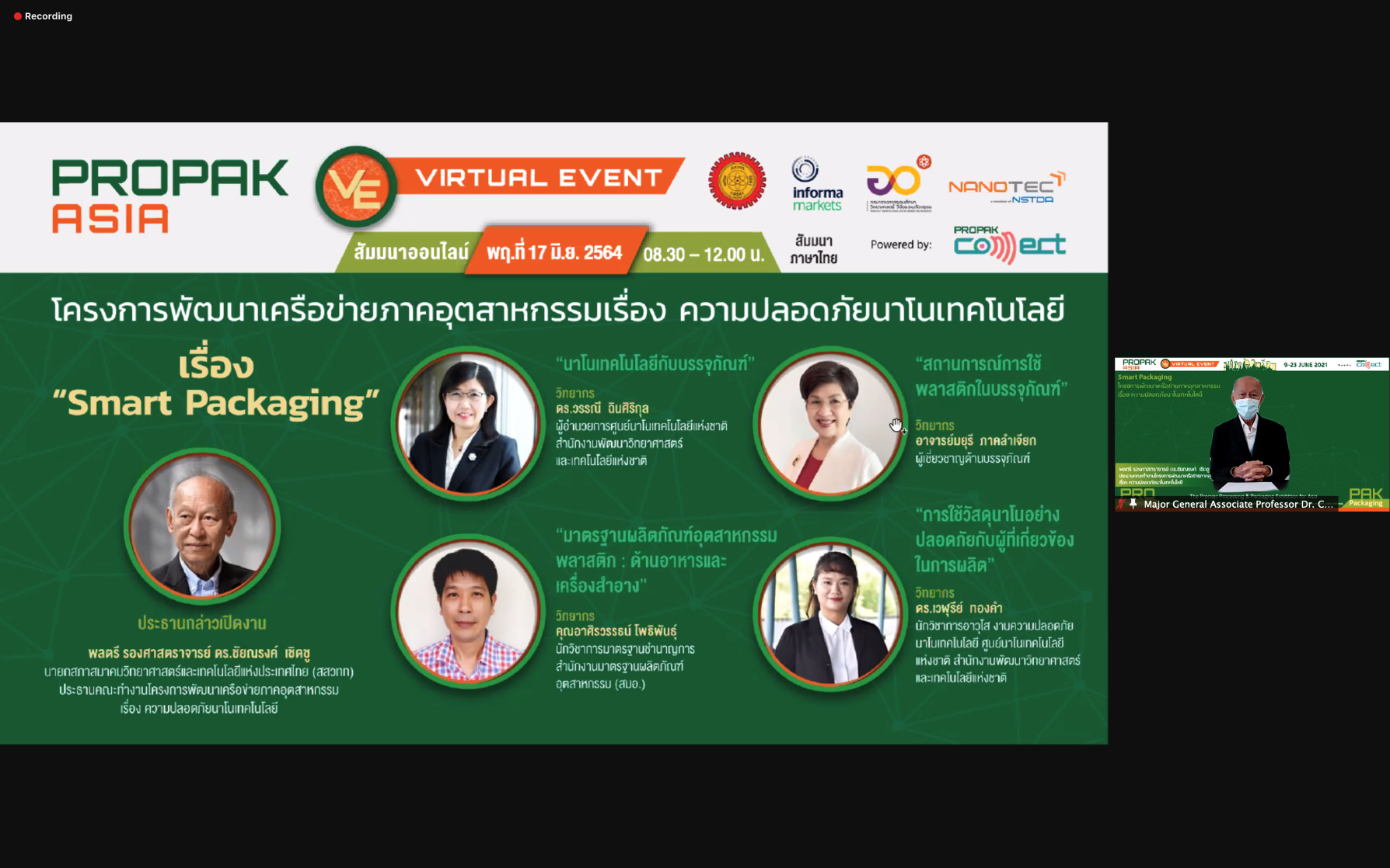 วันที่ 17 มิถุนายน 2564 นาโนเทค สวทช. จัดสัมมนาออนไลน์ (Webinar) โครงการพัฒนาเครือข่ายภาคอุตสาหกรรม เรื่อง ความปลอดภัยนาโนเทคโนโลยี หัวข้อ “Smart Packaging” ซึ่งเป็นส่วนหนึ่งของงาน The 28th International Processing and Packaging Exhibition for Asia หรือ ProPak Asia งานแสดงสินค้าอุตสาหกรรมและเทคโนโลยีด้านกระบวนการผลิต การแปรรูป และบรรจุภัณฑ์ แห่งภูมิภาคเอเชีย ครั้งที่ 28