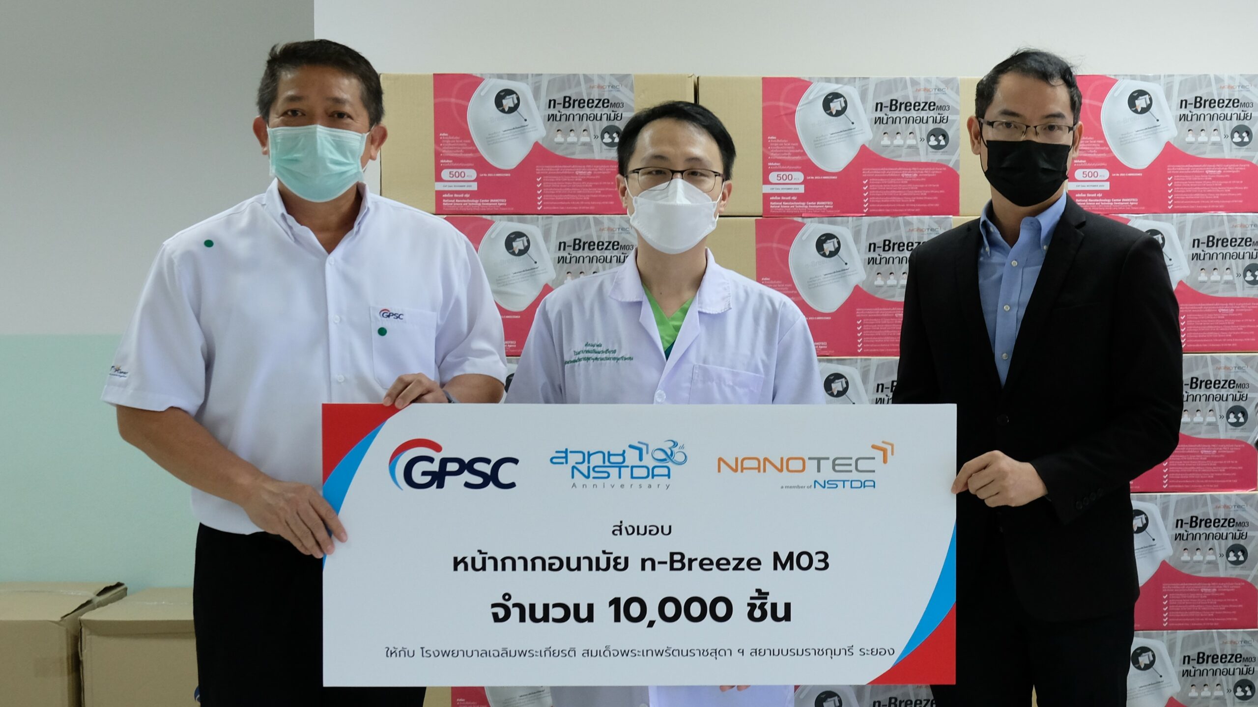 นาโนเทค สวทช. ส่งมอบหน้ากากอนามัย n-Breeze M03 จำนวน 10,000 ชิ้น ให้กับ โรงพยาบาลเฉลิมพระเกียรติ สมเด็จพระเทพรัตนราชสุดาฯ สยามบรมราชกุมารี ระยอง โดยความร่วมมือจาก บริษัท โกลบอล เพาเวอร์ ซินเนอร์ยี่ จำกัด (มหาชน)
