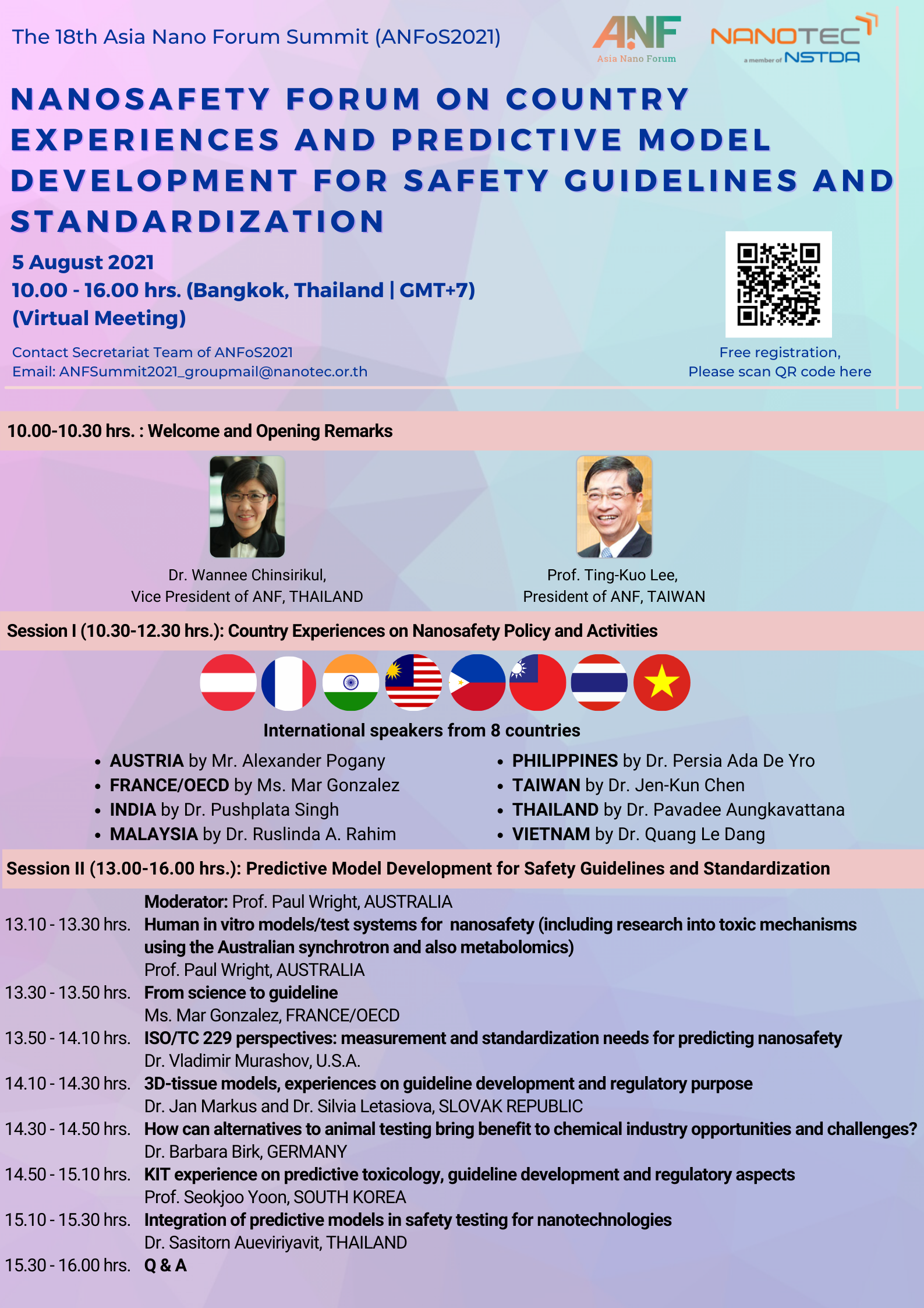 ศูนย์นาโนเทคโนโลยีแห่งชาติ (นาโนเทค) สำนักงานพัฒนาวิทยาศาสตร์และเทคโนโลยีแห่งชาติ (สวทช.) มีกำหนดเป็นเจ้าภาพจัด Nanosafety Forum งานประชุมเชิงเทคนิครูปแบบออนไลน์ ในวันที่ 5 สิงหาคม 2564 เวลา 10.00 – 16.00 น. โดยได้รับเกียรติจากวิทยากรต่างประเทศทั้งจากประเทศสมาชิก ANF และวิทยากรนานาชาติ อาทิ ออสเตรีย ออสเตรเลีย อินเดีย ฝรั่งเศส สโลวาเกีย สหพันธ์สาธารณรัฐเยอรมนี สหรัฐอเมริกา สาธารณรัฐเกาหลี ไต้หวัน และประเทศในภูมิภาคอาเซียน มาร่วมเป็นวิทยากร งานประชุมในครั้งนี้แบ่งเป็น 2 หัวข้อการบรรยายหลักคือ “Country Experiences on Nanosafety Policy and Activities” และ “Predictive Model Development for Safety Guidelines and Standardization” ซึ่งเป็นส่วนหนึ่งของ The 18th ASIA Nano Forum Summit หรืองานประชุมสุดยอดผู้นำสมาคมนาโนเทคโนโลยีแห่งเอเชียครั้งที่ 18 (ANF Summit 2021)