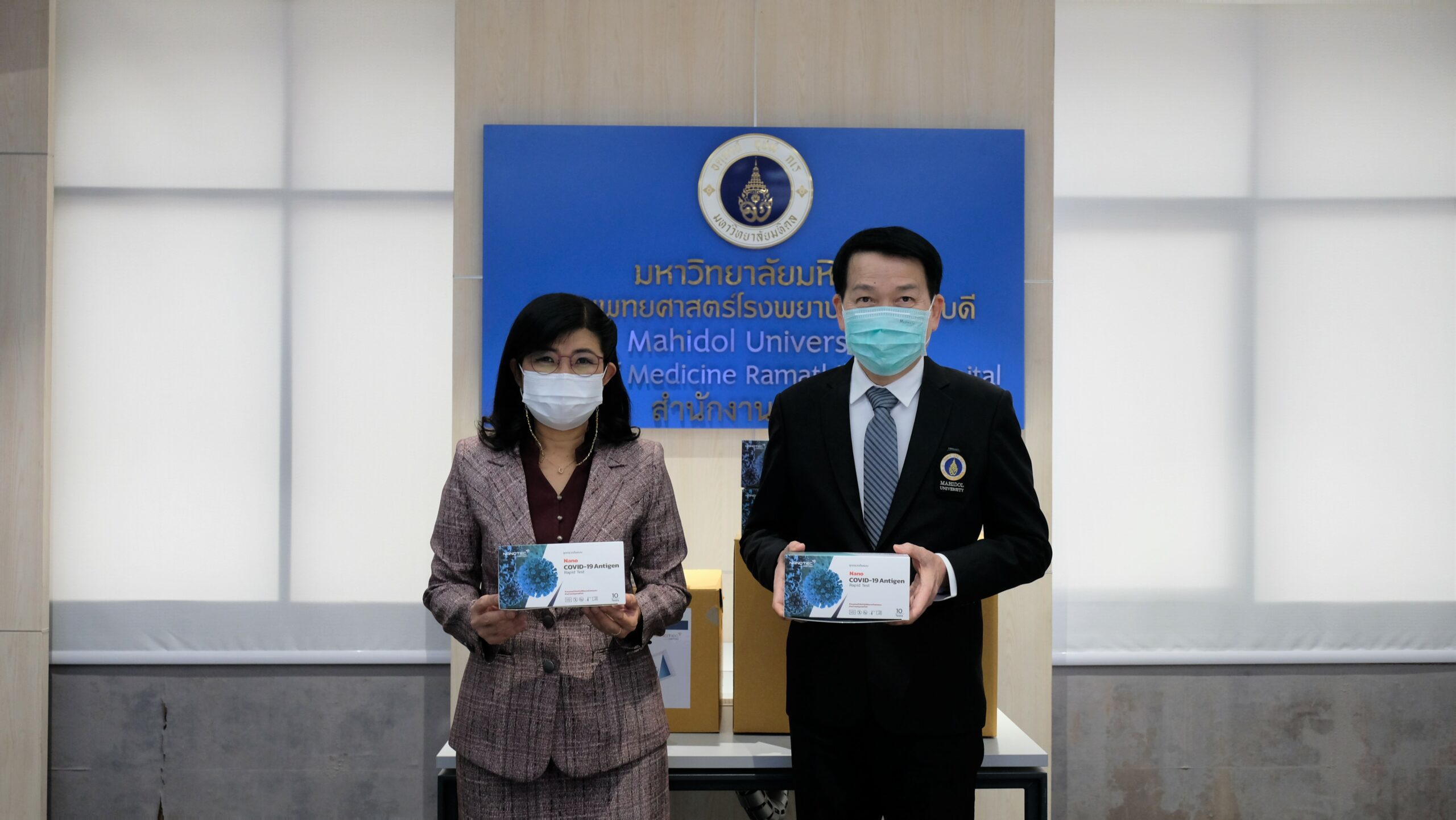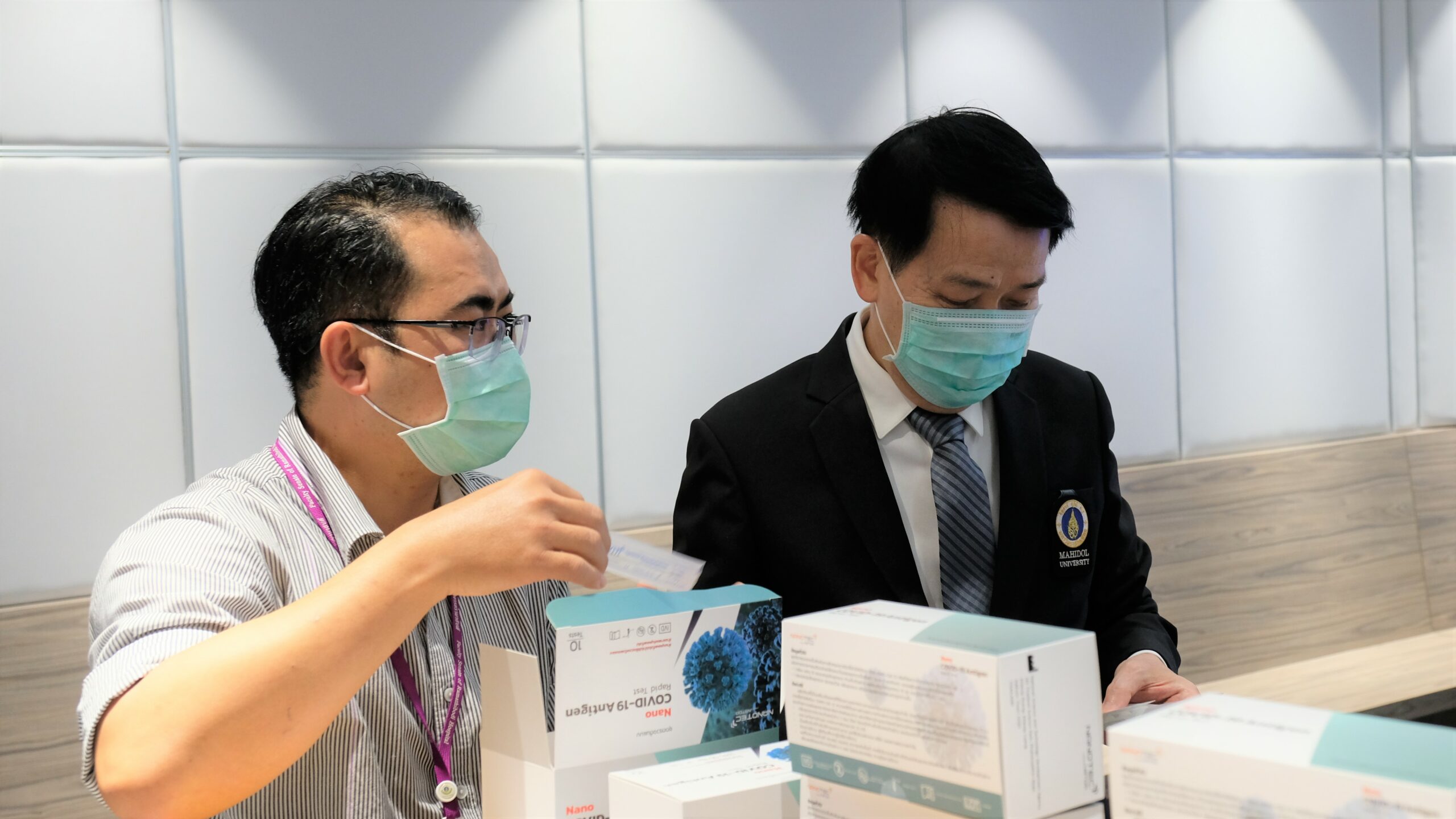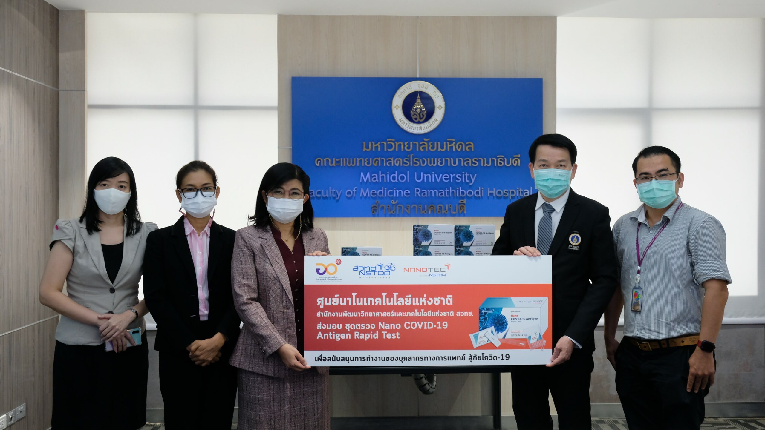 วันที่ 20 กรกฎาคม 2564 ดร.วรรณี ฉินศิริกุล ผู้อำนวยการศูนย์นาโนเทคโนโลยีแห่งชาติ พร้อมด้วย ดร.เดือนเพ็ญ จาปรุง ผู้อำนวยการกลุ่มวิจัยวัสดุตอบสนองและเซ็นเซอร์ระดับนาโน ดร. ณัฐปภัสร วิริยะชัยพร นักวิจัยทีมวิจัยวัสดุตอบสนองระดับนาโน ส่งมอบผลงาน “ชุดตรวจ NANO COVID-19 Antigen Rapid Test”จำนวน 500 ชิ้น ให้กับคณะแพทยศาสตร์โรงพยาบาลรามาธิบดี โดยมี ศ. นพ.ปิยะมิตร ศรีธรา คณบดีคณะแพทยศาสตร์โรงพยาบาลรามาธิบดี และ อาจารย์ ดร.เอกวัฒน์ ผสมทรัพย์ หัวหน้าห้องปฏิบัติการไวรัสวิทยา ภาควิชาพยาธิวิทยา คณะแพทยศาสตร์ เป็นผู้รับมอบ ณ ห้องประชุม 2 สำนักงานคณบดีชั้น 5 คณะแพทยศาสตร์ โรงพยาบาลรามาธิบดี ถนนพระราม 6 กรุงเทพมหานคร โดย นาโนเทค สวทช. มีแผนการส่งมอบชุดตรวจ NANO COVID-19 Antigen Rapid Test” อีกครั้งในวันพฤหัสบดีที่ 22 กรกฎาคม 2564 เพิ่มอีก จำนวน 500 ชุด รวมเป็น 1,000 ชุด