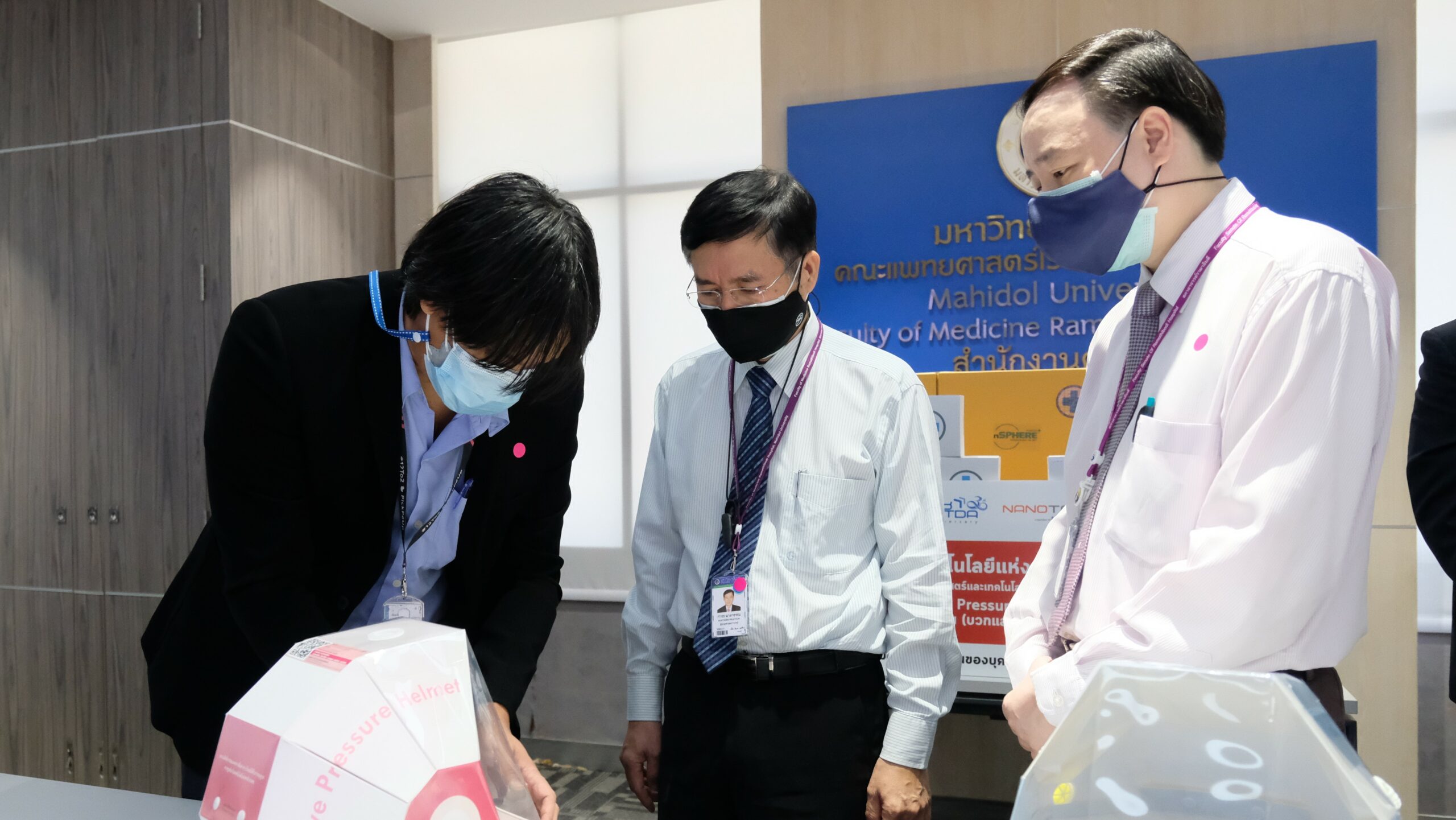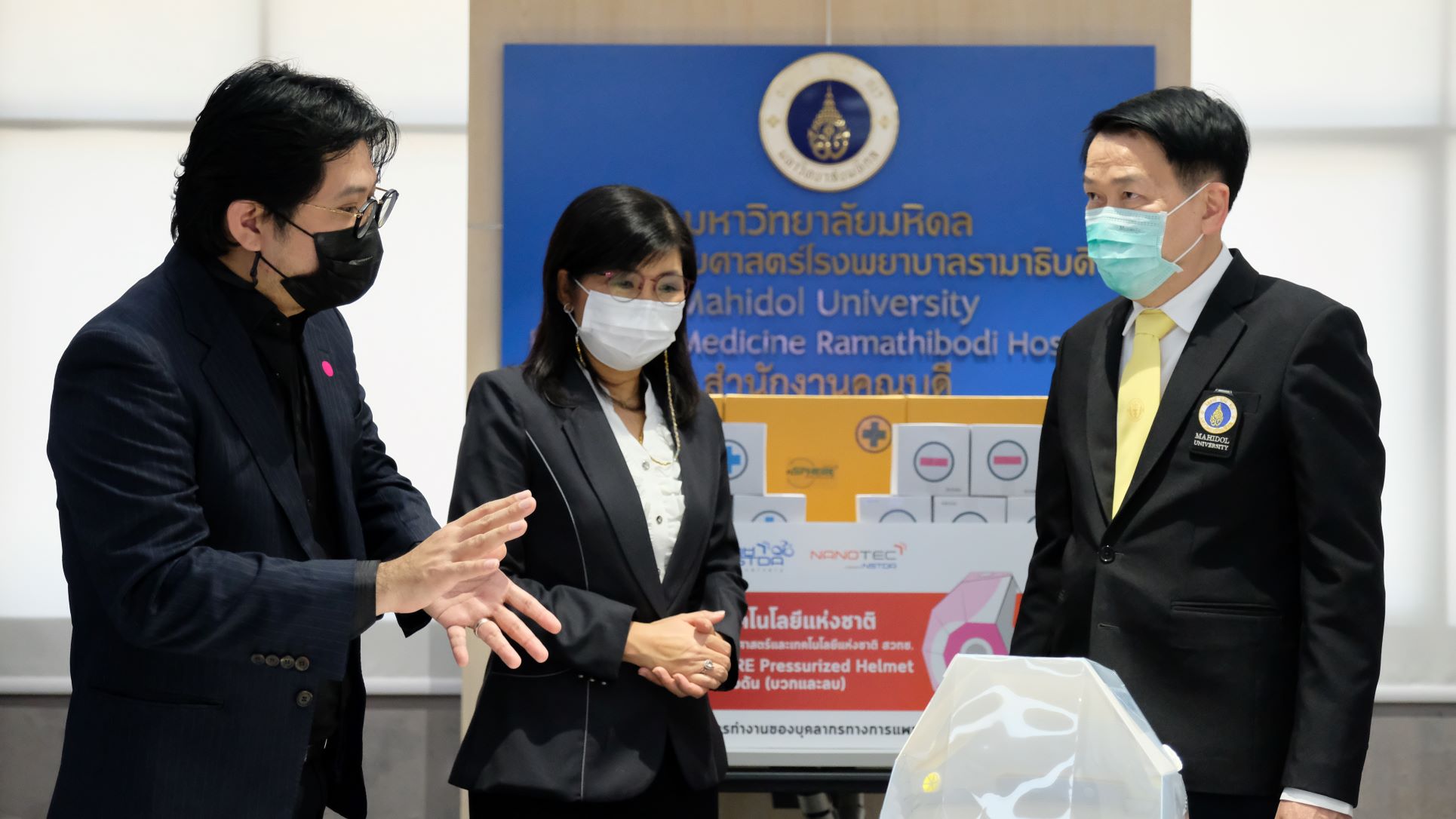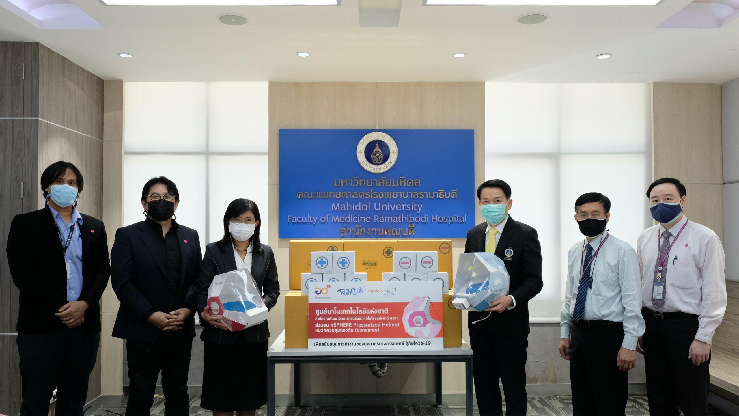(27 กรกฎาคม 2564) นาโนเทค สวทช. นำโดย ดร.วรรณี ฉินศิริกุล ผู้อำนวยการศูนย์นาโนเทคโนโลยีแห่งชาติ ดร.ไพศาล ขันชัยทิศ พร้อมทีมวิจัยเข็มระดับนาโน สาธิตและส่งมอบผลงาน “nSPHERE Pressurized Helmet” หมวกควบคุมแรงดันบวกและลบ ให้กับคณะแพทยศาสตร์โรงพยาบาลรามาธิบดี มหาวิทยาลัยมหิดล โดยมี ศ. นพ.ปิยะมิตร ศรีธรา คณบดีคณะแพทยศาสตร์โรงพยาบาลรามาธิบดี ผช.ศ.นพ.ชนเมธ เตชะแสนศิริ รองผู้อำนวยการโรงพยาบาลรามาธิบดี และ ผช. ศ.นพ. กำธร มาลาธรรม รองผู้อำนวยการโรงพยาบาลรามาธิบดี เป็นผู้รับมอบ ณ ห้องประชุม 2 สำนักงานคณบดี ชั้น 5 คณะแพทยศาสตร์ โรงพยาบาลรามาธิบดี มหาวิทยาลัยมหิดล ถนนพระราม 6 กรุงเทพมหานคร