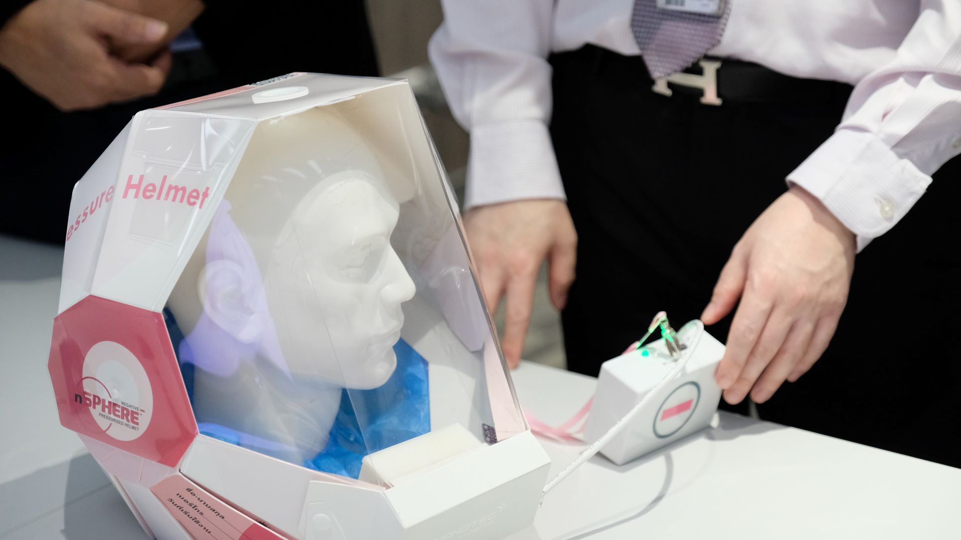 นวัตกรรม nSPHERE Pressurized Helmet หมวกควบคุมแรงดันบวกและลบ เป็นอุปกรณ์ส่วนบุคคลที่สามารถใช้งานได้สะดวกและมีประโยชน์ต่อการลดความเสี่ยงในการแพร่กระจายเชื้อ เนื่องจากหมวกฯ สามารถป้องกันละอองไอจามและฝุ่นได้ด้วยการกรองที่มีประสิทธิภาพร่วมกับการควบคุมแรงดันให้เหมาะกับประเภทของกลุ่มผู้ใช้งาน คือ หมวกแรงดันบวกสำหรับบุคลากรทางการแพทย์ (แรงดันภายในหมวกสูงกว่าภายนอก) และหมวกแรงดันลบสำหรับผู้ป่วยที่ติดเชื้อ (แรงดันภายในหมวกต่ำกว่าภายนอก)
