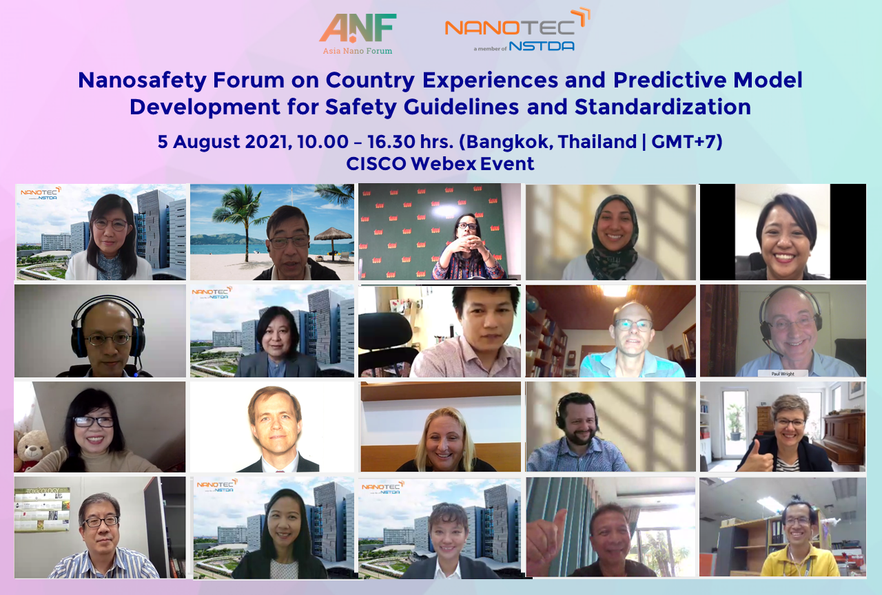 ในการประชุม ANFoS 2021 ได้มีการจัดการประชุมและเสวนาอีก 2 กิจกรรมคือ Nanosafety Forum ภายใต้หัวข้อ “Country Experiences and Predictive Model Development for Safety Guidelines and Standardization” จัดโดย Asia Nano Forum Working Group on Nanosafety and Risk Management (คณะทำงานด้านความปลอดภัยนาโนเทคโนโลยีและการจัดการความเสี่ยง) เมื่อวันที่ 5 สิงหาคม โดยมี ดร.วรรณี ฉินศิริกุล ผู้แทนนาโนเทค สวทช. และ Assoc. Prof. Paul Wright ผู้แทนจากมหาวิทยาลัย RMIT ประเทศออสเตรเลียเป็นผู้ประสานงานหลักในคณะทำงานดังกล่าว กิจกรรม Nanosafety Forum จัดขึ้นโดยมีวัตถุประสงค์เพื่อแลกเปลี่ยนเรียนรู้กิจกรรมการด้านนาโนเทคโนโลยีของแต่ละประเทศ และ แบ่งปันประสบการณ์การทำงานด้าน ISO และมาตรฐานที่เกี่ยวข้องกับ nanosafety ISO/TC229 เพื่อนำไปสู่ความร่วมมือร่วมกันในภูมิภาค การประชุมดังกล่าวมีวิทยากร และผู้เข้าร่วมประชุมทั้งสิ้น 210 คนจากทั้งภูมิภาคยุโรป อเมริกาและเอเชีย (สามารถรับชมคลิปย้อนหลังได้ที่ https://sharebox.nstda.or.th/d/d3cbec0b)
