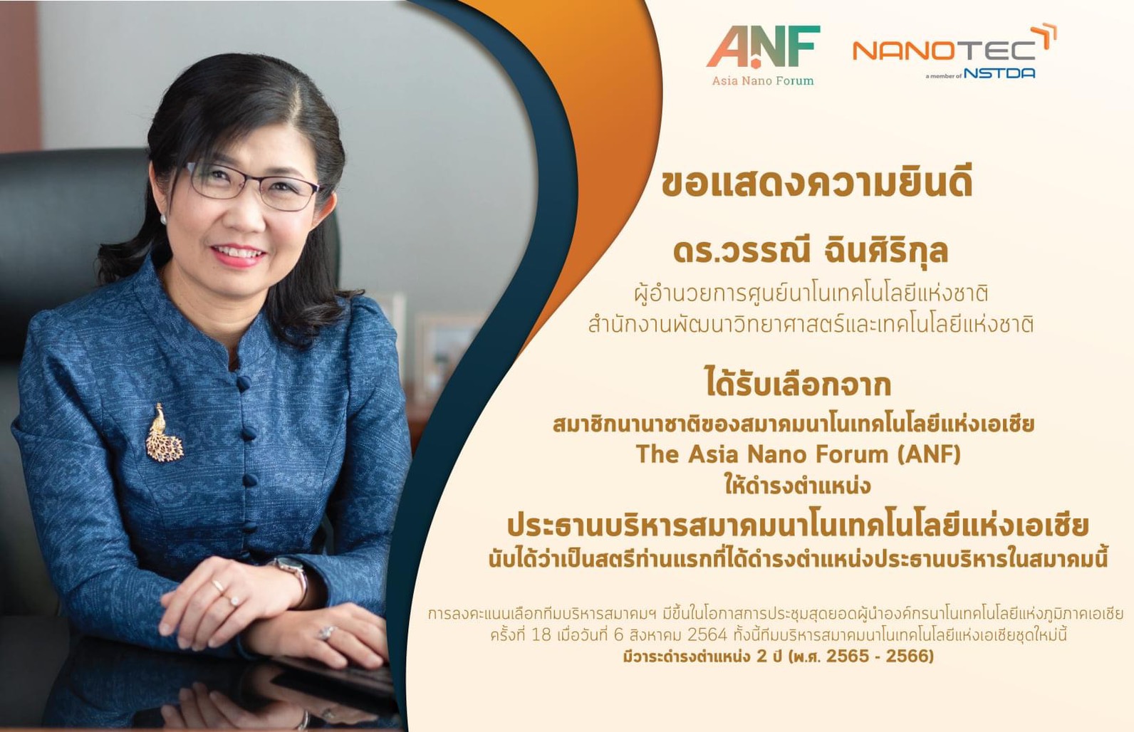 ขอแสดงความยินดีกับ ผศน. ดร.วรรณี ฉินศิริกุล ผู้อำนวยการศูนย์นาโนเทคโนโลยีแห่งชาติ สวทช. ได้รับเลือกจาก สมาชิกนานาชาติของสมาคมนาโนเทคโนโลยีแห่งเอเชีย The Asia Nano Forum (ANF) ให้ดำรงตำแหน่งประธานบริหารสมาคมนาโนเทคโนโลยีแห่งเอเชีย นับได้ว่าเป็นสตรีท่านแรกที่ได้ดำรงตำแหน่งประธานบริหารในสมาคมนี้