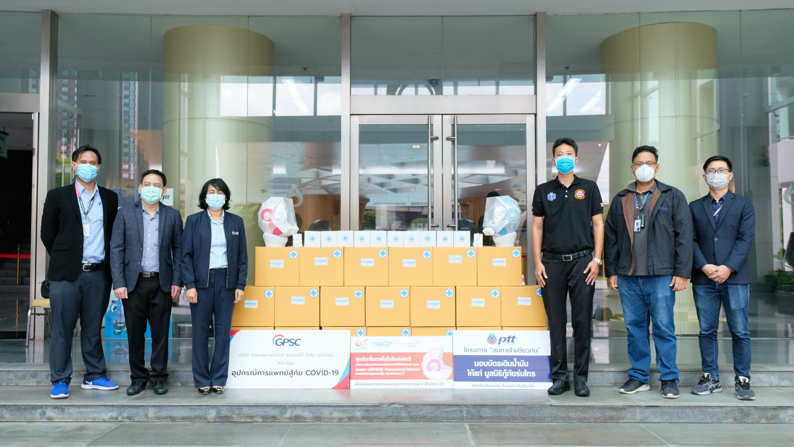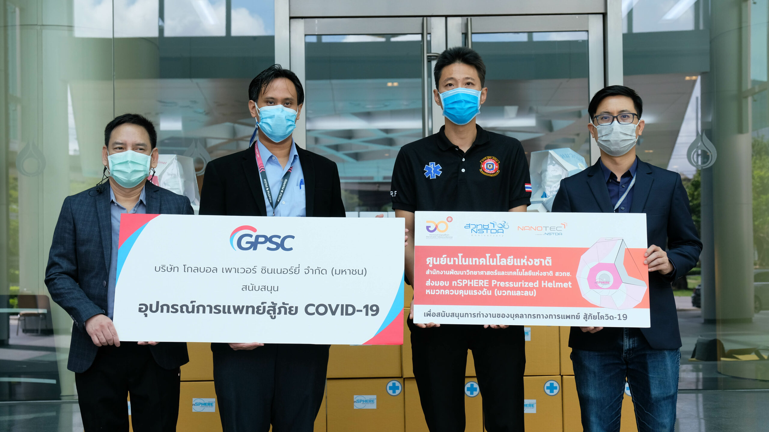 นาโนเทค สวทช. นำโดย ดร.กิตติพงษ์ ตันติสันติสม และ ดร.ธิติกร บุญคุ้ม นำผลงานวิจัย nSPHERE Pressurized Helmet หมวกควบคุมแรงดันบวกพร้อมอุปกรณ์ควบคุม Controller มอบให้กับ มูลนิธิกู้ภัยร่มไทร โดยการสนับสนุนของ บริษัท โกลบอล เพาเวอร์ ซินเนอร์ยี่ จำกัด (มหาชน) หรือ GPSC โดยมี คุณณรงค์ชัย วิสูตรชัย ผู้จัดการฝ่ายอาวุโสรัฐวิสาหกิจสัมพันธ์และกิจการสาธารณะ และผู้แทนมูลนิธิกู้ภัยร่มไทร เป็นผู้รับมอบ ณ สำนักงานใหญ่ ปตท. ถนนวิภาวดีรังสิต