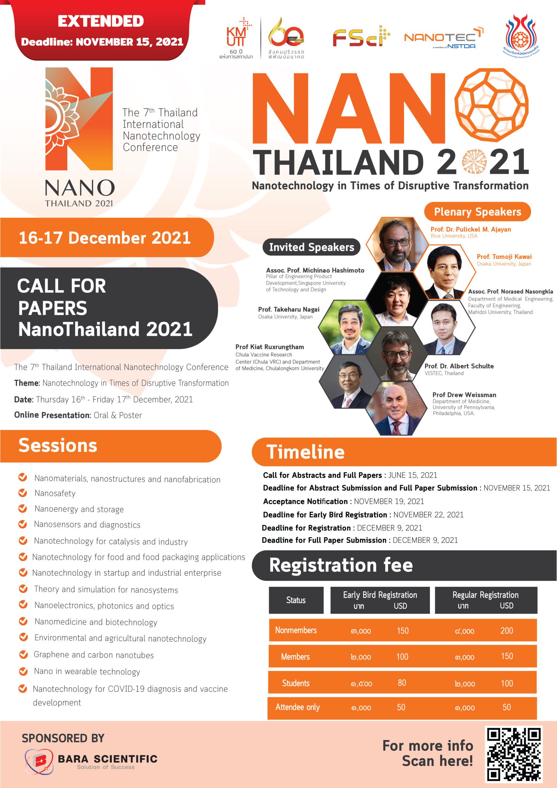 “งานประชุมวิชาการและนิทรรศการระดับนานาชาติทางนาโนเทคโนโลยี ครั้งที่ 7 (NanoThailand 2021)” โดยสมาคมนาโนเทคโนโลยีแห่งประเทศไทย และคณะวิทยาศาสตร์ มหาวิทยาลัยเทคโนโลยีพระจอมเกล้าธนบุรี จากการสนับสนุนของศูนย์นาโนเทคโนโลยีแห่งชาติ (นาโนเทค) สำนักงานพัฒนาวิทยาศาสตร์และเทคโนโลยีแห่งชาติ (สวทช.) ภายใต้แนวคิด “Nanotechnology in Times and Disruptive Transformation” ระหว่างวันที่ 16 – 17 ธันวาคม 2564 ในรูปแบบออนไลน์ โดยการประชุมผ่านสื่ออิเล็กทรอนิกส์ ขยายเวลา ส่ง abstarct ถึง 15 พฤศจิกายนนี้ พร้อมเพิ่มไฮไลต์อย่าง Planary speakers ที่น่าสนใจเพิ่ม คือ ศ.นพ.เกียรติ รักษ์รุ่งธรรม ผู้อำนวยการบริหารโครงการพัฒนาวัคซีนโควิด-19 ศูนย์วิจัยวัคซีน คณะแพทยศาสตร์ จุฬาลงกรณ์มหาวิทยาลัย กับ Pof.Drew Weissman จากมหาวิทยาลัยเพนซิลวาเนีย สหรัฐอเมริกา ที่จะมาพูดเรื่อง “Nanotechnology in mRNA COVID-19 Vaccine” (หัวข้ออาจมีการเปลี่ยนแปลง)