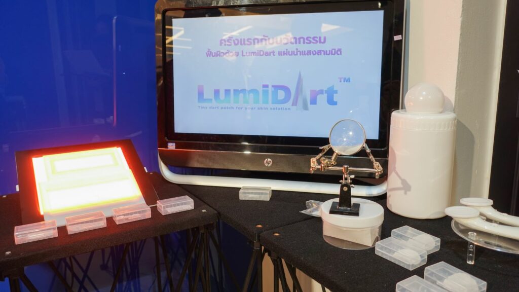 “ลูมิดาร์ท (LumiDart)” แผ่นเข็มนำแสงสามมิติที่มีขนาดเล็กมากในระดับไมโครเมตร โดย ดร. ไพศาล ขันชัยทิศ หัวหน้าทีมวิจัยเข็มระดับนาโน กลุ่มวิจัยวัสดุตอบสนองและเซ็นเซอร์ระดับนาโน นาโนเทคและทีมฯ ที่ผสานเทคโนโลยีเข็มขนาดไมโคร (MicroNeedles) กับการบำบัดผิวด้วยการฉายแสง (Phototherapy)สู่ตัวช่วยนำพาแสงไปยังชั้นใต้ผิวหนังโดยตรง ด้วยจุดเด่นคือ ใช้ความเข้มแสงน้อย เพิ่มประสิทธิภาพ และไม่เจ็บ แก้ปัญหาผิว อาทิ สิว จุดด่างดำ ผิวหน้าหย่อนคล้อย หรือรอยแผลเป็นจากสิว