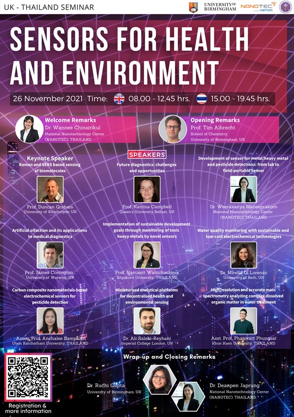 นาโนเทค สวทช. ประเทศไทย ร่วมกับมหาวิทยาลัยเบอร์มิ่งแฮม สหราชอาณาจักร ขอเชิญชวนทุกท่านเข้าร่วมงานสัมมนาออนไลน์ในหัวข้อเซ็นเซอร์เพื่อสุขภาพและสิ่งแวดล้อมในวันศุกร์ที่ 26 พฤศจิกายน 2564 เวลา 15.00 น. (เวลาประเทศไทย) เป็นต้นไปผ่านระบบการประชุมออนไลน์ zoom