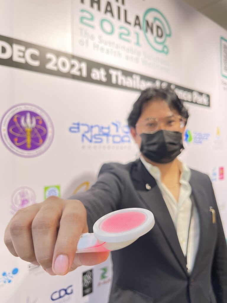 “การใช้แสงในการบำบัดนั้น จำเป็นต้องใช้พลังงานสูงมาก ทำให้แสงทำปฏิกิริยากับเซลล์ผิวได้ ดังนั้น เราจึงประยุกต์ใช้ร่วมกับแผ่นเข็มนำแสงสามมิติระดับไมโครเมตร ช่วยเพิ่มประสิทธิภาพการบำบัดโดยการนำพาแสงไปยังชั้นใต้ผิวหนังได้โดยตรงเพื่อแก้ไขปัญหาได้อย่างตรงจุด จึงใช้พลังงานหรือความเข้มแสงน้อย ซึ่งช่วยลดอันตรายจากการได้รับแสงความเข้มสูงเป็นเวลานาน ไม่ก่อให้เกิดความเจ็บปวดต่อผู้ใช้งาน” ดร.ไพศาลกล่าว