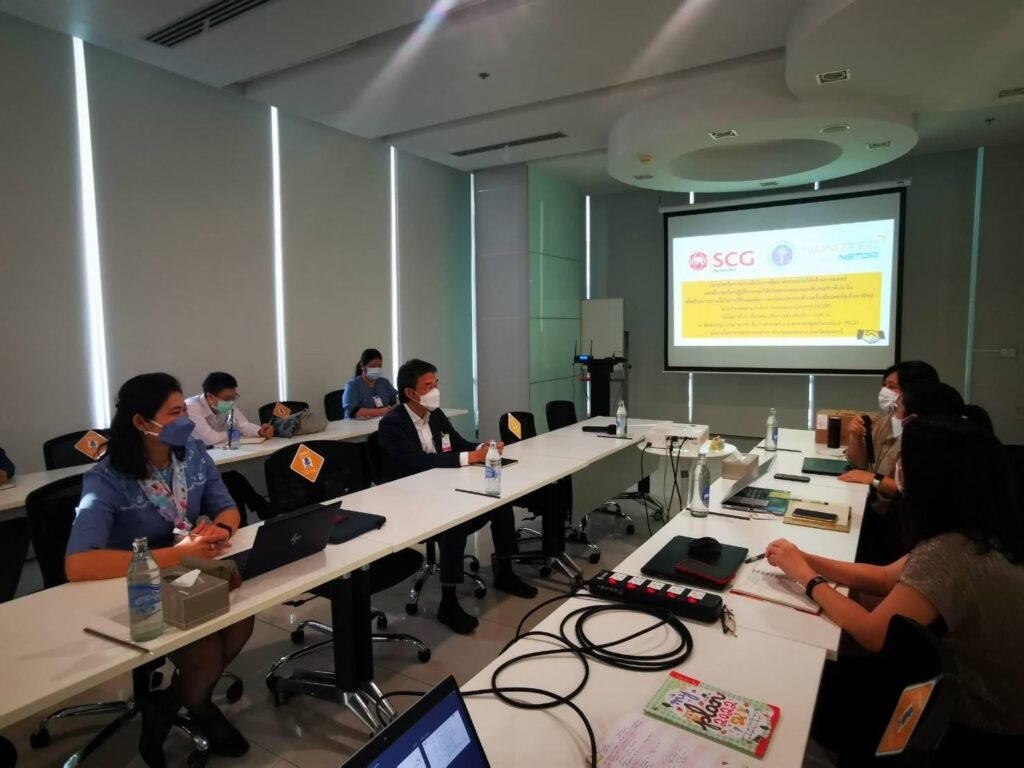 เมื่อวันที่ 21 ธันวาคม 2564 ดร.ภาวดี อังค์วัฒนะ รองผู้อำนวยการศูนย์นาโนเทคโนโลยีแห่งชาติ พร้อมด้วยนักวิจัยจากกลุ่มวิจัยวัสดุตอบสนองและเซ็นเซอร์ระดับนาโน และทีมพัฒนาธุรกิจ ให้การต้อนรับคณะผู้บริหารจากบริษัท SCG Packaging Public Company Limited (SCGP) ในการประชุมหารือความร่วมมือเพื่อการพัฒนาต่อยอดงานวิจัยด้านการแพทย์ พร้อมทั้งเยี่ยมชมผลงานวิจัยของทีมวิจัยภายใต้กลุ่มวิจัยวัสดุตอบสนองและเซ็นเซอร์ระดับนาโน ประกอบด้วย ทีมวิจัยวัสดุตอบสนองระดับนาโน ทีมวิจัยการวินิจฉัยระดับนาโน และทีมวิจัยเข็มระดับนาโน โดยได้นำเสนอผลงานวิจัยด้านการแพทย์ เช่น ความเชี่ยวชาญด้านการพัฒนาชุดตรวจแบบรวดเร็วเพื่อการวินิจฉัยและคัดกรองโรคเบื้องต้น และหมวกเอ็นสเฟียร์ โดยงานวิจัยเหล่านี้ได้มีการนำไปใช้ประโยชน์จริงแล้วแก่ภาคสังคม นอกจากนี้ยังได้มีการหารือร่วมกันเพื่อสร้างโอกาสในการเกิดแนวทางความร่วมมืองานวิจัยด้านการแพทย์ร่วมกันในอนาคตอีกด้วย
