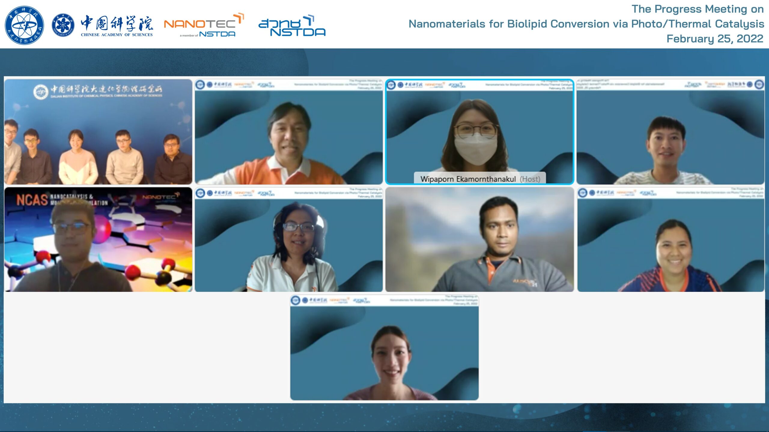 On 25 February 2022, National Nanotechnology Center (NANOTEC), THAILAND in collaboration with Dalian Institute of Chemical Physics (DICP), Chinese Academy of Sciences (CAS), P.R. China had a virtual meeting to discuss about the progress of the research project on “Nanomaterials for Biolipid Conversion via Photo/Thermal Catalysis”. This research project is supported by CAS-NSTDA Joint Research Program for 3 years. The principal investigator from NANOTEC is Dr. Kajornsak Faungnawakij, director of nanocatalysis and molecular simulation research group and the principal investigator from DICP is Prof. Feng Wang, director of biomass and bioenergy division.