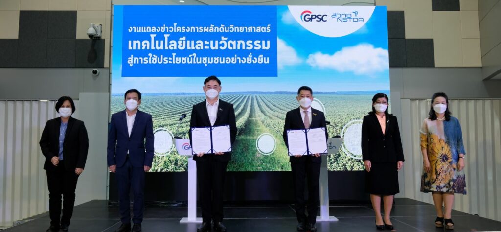 การลงนามบันทึกข้อตกลง (MOU) ด้านการดำเนินงาน “โครงการผลักดันวิทยาศาสตร์ เทคโนโลยีและนวัตกรรมสู่การใช้ประโยชน์ในชุมชนอย่างยั่งยืน”ระหว่าง สวทช. โดยศูนย์นาโนเทคโนโลยีแห่งชาติ (นาโนเทค), สถาบันการจัดการเทคโนโลยีและนวัตกรรมเกษตร (สท.) และบริษัท โกลบอล เพาเวอร์ ซินเนอร์ยี่ จำกัด (มหาชน) หรือ GPSC ที่จะร่วมสนับสนุนการขยายผลงานวิจัยของ สวทช.ด้านพลังงาน สิ่งแวดล้อม สุขภาพ และการแพทย์มาประยุกต์ใช้เพื่อขับเคลื่อน โดยมีโครงการ GPSC Smart Farming (เกษตรอัจฉริยะ) เป็นโครงการนำร่อง 2 ชุมชน ในการยกระดับเศรษฐกิจชุมชนและสิ่งแวดล้อมให้เกิดความยั่งยืน และมีเป้าหมายการดำเนินงานภายในกรอบระยะเวลา 3 ปี (ต.ค.64 – ต.ค.67) นำร่องด้วยโครงการ GPSC Smart Farming โดยพัฒนาโรงเรือนอัจฉริยะใน 2 ชุมชนคือ บ้านสวนต้นน้ำ อ.เขาชะเมา จ.ระยอง และ บ้านห้วยขาบ อ.บ่อเกลือ จ.น่าน ขับเคลื่อนเกษตรวิถีใหม่ด้วยนวัตกรรม พร้อมเตรียมขยายผลสู่ชุมชนเครือข่ายในพื้นที่ทั่วประเทศ