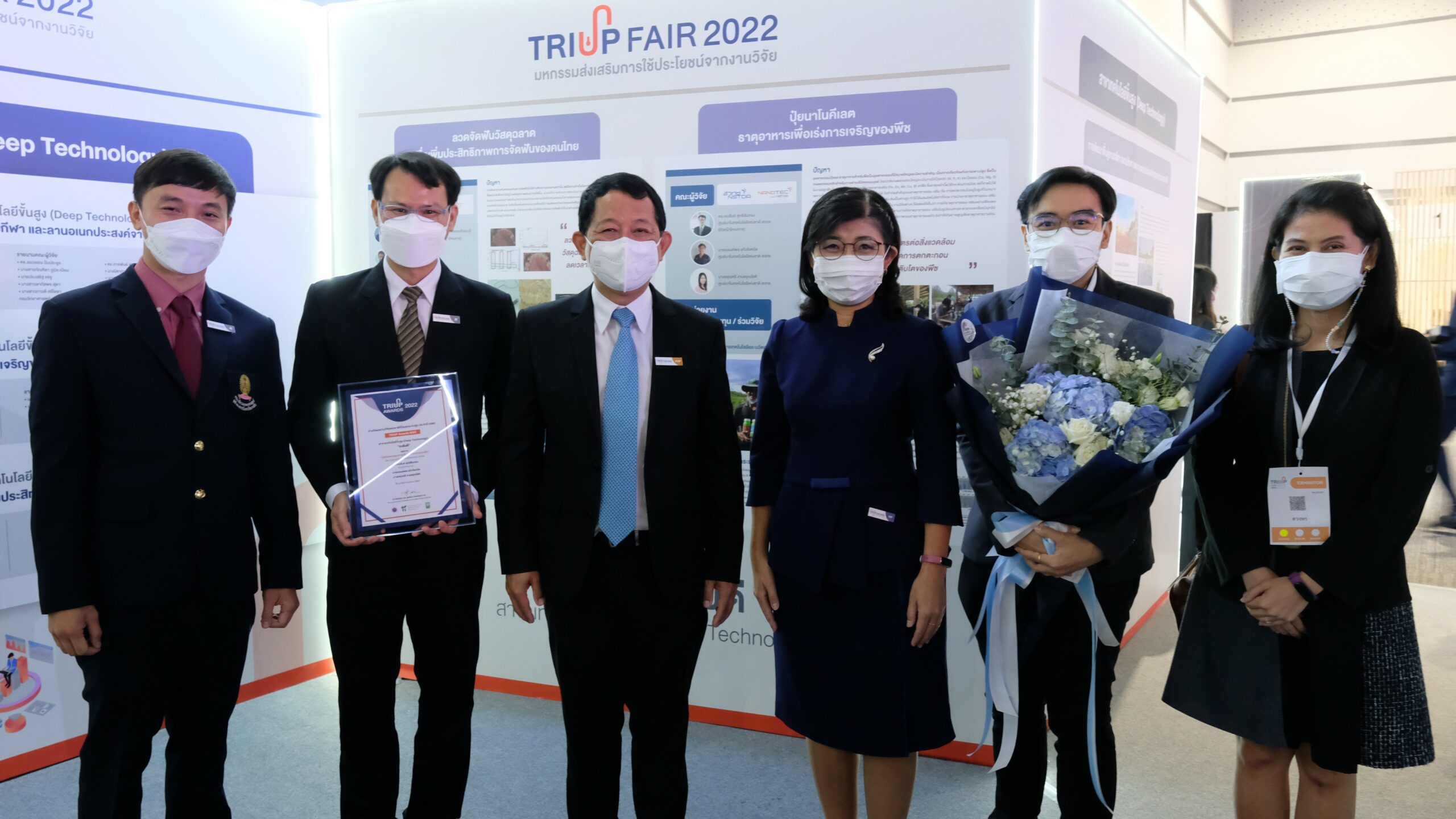 4 เมษายน 2565  ดร. วรรณี ฉินศิริกุล ผู้อำนวยการศูนย์นาโนเทคโนโลยีแห่งชาติ  เข้าร่วมพิธีเปิดงาน  “มหกรรมส่งเสริมการใช้ประโยชน์จากงานวิจัย TRIUP Fair 2022” และมอบช่อดอกไม้แสดงความยินดีกับ ดร. คมสันต์ สุทธิสินทอง และคณะทีมวิจัยนาโนเทคโนโลยีเพื่อคุณภาพชีวิตและเวชสำอาง กลุ่มวิจัยการห่อหุ้มระดับนาโน ในโอกาสได้รับรางวัลผลงานวิจัยแห่งชาติที่มีผลกระทบสูง ระดับดี ประจำปี 2565 Prime Minister’s TRIUP Award for Research Utilization with High Impact 2022  ซึ่งมีผู้ได้รับรางวัล 6 ผลงาน จากผลงานที่ส่งเข้าประกวดทั้งหมด 119 ผลงาน  พร้อมเงินรางวัลจากกองทุนส่งเสริมวิทยาศาสตร์ วิจัยและนวัตกรรม (กองทุนส่งเสริม ววน.) รางวัล 100,000 บาท