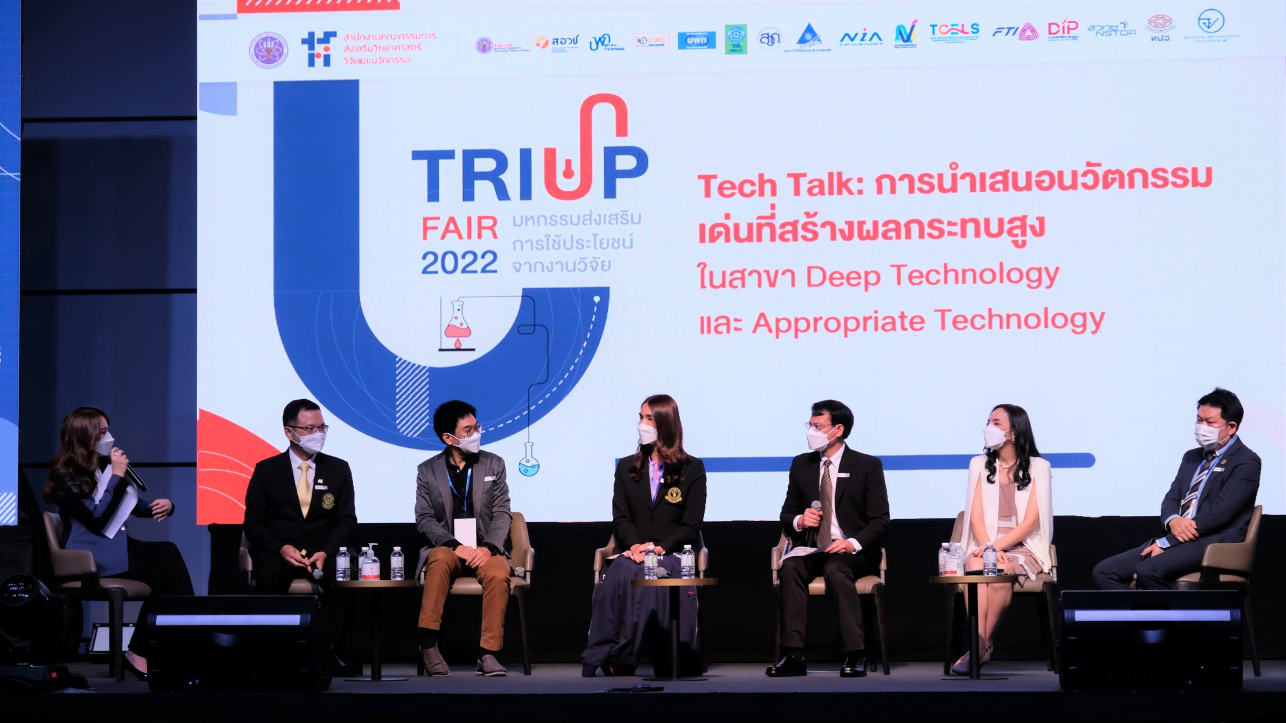 หลังจากนั้น  ดร.คมสันต์ สุทธิสินทอง  และผู้ที่ได้รับรางวัลจากการประกวดนวัตกรรมที่สร้างผลกระทบสูง Prime Minister’s Awards for Research Utilization with High Impact ได้ร่วมนำเสนอนวัตกรรมเด่นที่สร้างผลกระทบสูง (ทั้ง Deep Technology และ Appropriate Technology) และนำเสนอผลงานวิจัยและนวัตกรรม ซึ่งสร้างผลกระทบสูง ต่อเศรษฐกิจ สังคม และสิ่งแวดล้อม ตลอดจนสร้างความรู้ความเข้าใจ และสื่อให้เห็นความสำคัญของลักษณะที่แตกต่างระหว่างเทคโนโลยีขั้นสูง (Deep Technology) และเทคโนโลยีที่เหมาะสม (Appropriate Technology) อันเป็นผลจากการพัฒนางานวิจัยที่มุ่งเป้าสู่การใช้ประโยชน์การแก้ไขปัญหาสำคัญ หรือการพัฒนาประเทศ ตามความประสงค์ของการสร้าง พ.ร.บ. ส่งเสริมการใช้ประโยชน์ผลงานวิจัยและนวัตกรรม ทั้งนี้ภายในงานยังมีเวทีเสวนา “Tech Talk: การนำเสนอเทคโนโลยีเด่นที่สร้างผลกระทบสูง ในสาขา Deep Technology และ Appropriate Technology”