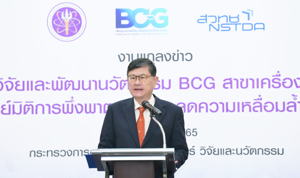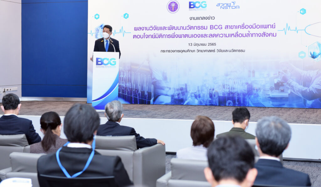 (วันที่ 13 มิถุนายน 2565) ณ ห้องแถลงข่าว ชั้น 1 อาคารพระจอมเกล้า สำนักงานปลัดกระทรวง อว. : กระทรวงการอุดมศึกษา วิทยาศาสตร์ วิจัยและนวัตกรรม (อว.) โดย ดร.ณรงค์ ศิริเลิศวรกุล ผู้อำนวยการสำนักงานพัฒนาวิทยาศาสตร์และเทคโนโลยีแห่งชาติ (สวทช.) พร้อมด้วย ศาสตราจารย์ ดร.ไพรัช ธัชยพงษ์ อดีตปลัดกระทรวงวิทยาศาสตร์และเทคโนโลยี ในฐานะประธาน BCG สาขาเครื่องมือแพทย์ ดร.ศรัณย์ สัมฤทธิ์เดชขจร ผู้อำนวยการ ศูนย์วิจัยเทคโนโลยีสิ่งอำนวยความสะดวกและเครื่องมือแพทย์ (A-MED) ดร.วรรณี ฉินศิริกุล ผู้อำนวยการศูนย์นาโนเทคโนโลยีแห่งชาติ (นาโนเทค) นพ.สินชัย ต่อวัฒนกิจกุล รองเลขาสำนักงานหลักประกันสุขภาพแห่งชาติ (สปสช.) ร่วมแถลงข่าวผลงานวิจัยและพัฒนานวัตกรรมด้านสุขภาพและการแพทย์ที่ตอบโจทย์ BCG มิติการพึ่งพาตนเองและลดความเหลื่อมล้ำทางสังคม โดยได้รับเกียรติจาก ศาสตราจารย์ (พิเศษ) ดร.เอนก เหล่าธรรมทัศน์ รัฐมนตรีว่าการกระทรวงการอุดมศึกษา วิทยาศาสตร์ วิจัยและนวัตกรรม (อว.) เป็นประธานแถลงข่าวและร่วมแสดงความยินดี โดยมีผู้แทนจากหน่วยงานที่นำนวัตกรรมไปใช้และให้บริการ อาทิ กรมการแพทย์ กระทรวงสาธารณสุข สำนักอนามัย กรุงเทพมหานคร สภาเภสัชกรรม สำนักงานพัฒนารัฐบาลดิจิทัล (องค์การมหาชน) บริษัทเวลล์เนส อินโนเวชั่น บียอนด์ จำกัด และบริษัท เมดิคิวบ์ จำกัด ร่วมงานแถลงข่าว