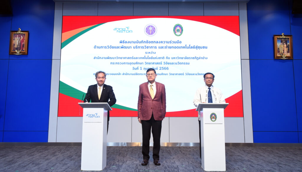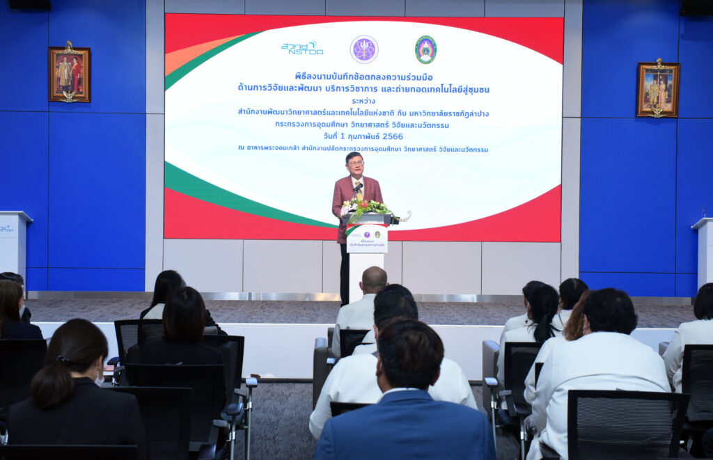 (เมื่อวันที่ 1 กุมภาพันธ์ 2566) ที่ห้องแถลงข่าว ชั้น 1 กระทรวงการอุดมศึกษา วิทยาศาสตร์ วิจัยและนวัตกรรม : สำนักงานพัฒนาวิทยาศาสตร์และเทคโนโลยีแห่งชาติ (สวทช.) และมหาวิทยาลัยราชภัฏลำปาง ลงนามในบันทึกข้อตกลงความร่วมมือด้านการวิจัยและพัฒนา การบริการวิชาการการจัดการความรู้ และการถ่ายทอดเทคโนโลยีสู่ชุมชน มุ่งเน้น 3 ด้านคือ การเกษตร การบริหารจัดการน้ำ และการพัฒนากำลังคน นำร่องด้วยฐานข้อมูลด้านคุณภาพน้ำประปาที่มีการปนเปื้อนฟลูออไรด์ โลหะหนัก และสารเคมีตกค้างด้วยนาโนเทคโนโลยี ในโรงเรียนพื้นที่ลำปางกว่า 100 แห่ง เพื่อสร้างนวัตกรคุณภาพน้ำ 100 คน รวมถึงนวัตกรรมตรวจวัดและพัฒนาคุณภาพน้ำในพื้นที่จังหวัดลำปางกว่า 270 ครัวเรือน ด้วยเป้าหมาย 2 ลด 3 เพิ่ม คือ ลดโรค ลดค่าใช้จ่าย เพิ่มการเข้าถึงน้ำสะอาด เพิ่มคุณภาพน้ำและคุณภาพชีวิต