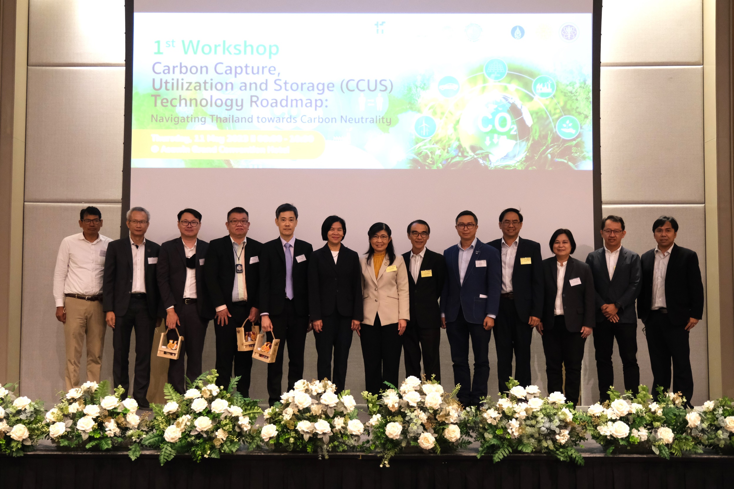 เมื่อวันที่ 11 พฤษภาคม 2566 ณ โรงแรมอัศวิน แกรนด์ คอนเวนชั่น - ศูนย์นาโนเทคโนโลยีแห่งชาติ (นาโนเทค) สำนักงานพัฒนาวิทยาศาสตร์และเทคโนโลยีแห่งชาติ (สวทช.) นำโดย ดร.วรรณี ฉินศิริกุล ผู้อำนวยการ ร่วมกับเครือข่ายพันธมิตร จัดการสัมมนาเชิงปฏิบัติการ "Carbon Capture, Utilization and Storage (CCUS) Technology Roadmap" Navigating Thailand towards Carbon Neutrality ครั้งที่ 1 โดยการสนับสนุนจากสำนักงานคณะกรรมการส่งเสริมวิทยาศาสตร์ วิจัย และนวัตกรรม (สกสว.) ซึ่งได้รับเกียรติจาก ดร. พงษ์วิภา หล่อสมบูรณ์ ผู้เชี่ยวชาญระดับสูงด้านสิ่งแวดล้อม จาก สกสว. เป็นผู้กล่าวเปิดงาน พร้อมทั้งหน่วยงานผู้เข้าร่วมกิจกรรมทั้งจากภาครัฐ ภาคเอกชน และหน่วยงานรัฐวิสาหกิจ กว่า 52 หน่วยงาน รวมผู้เข้าร่วมราว 150 คน