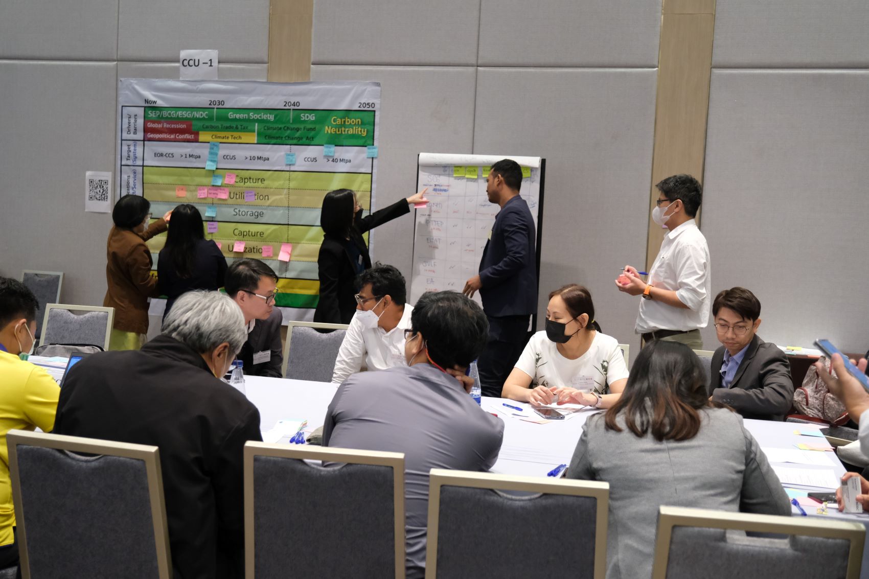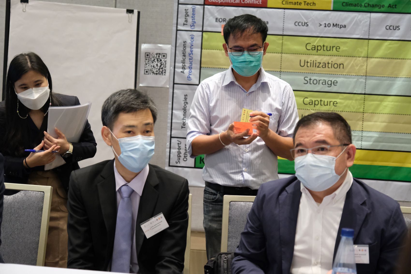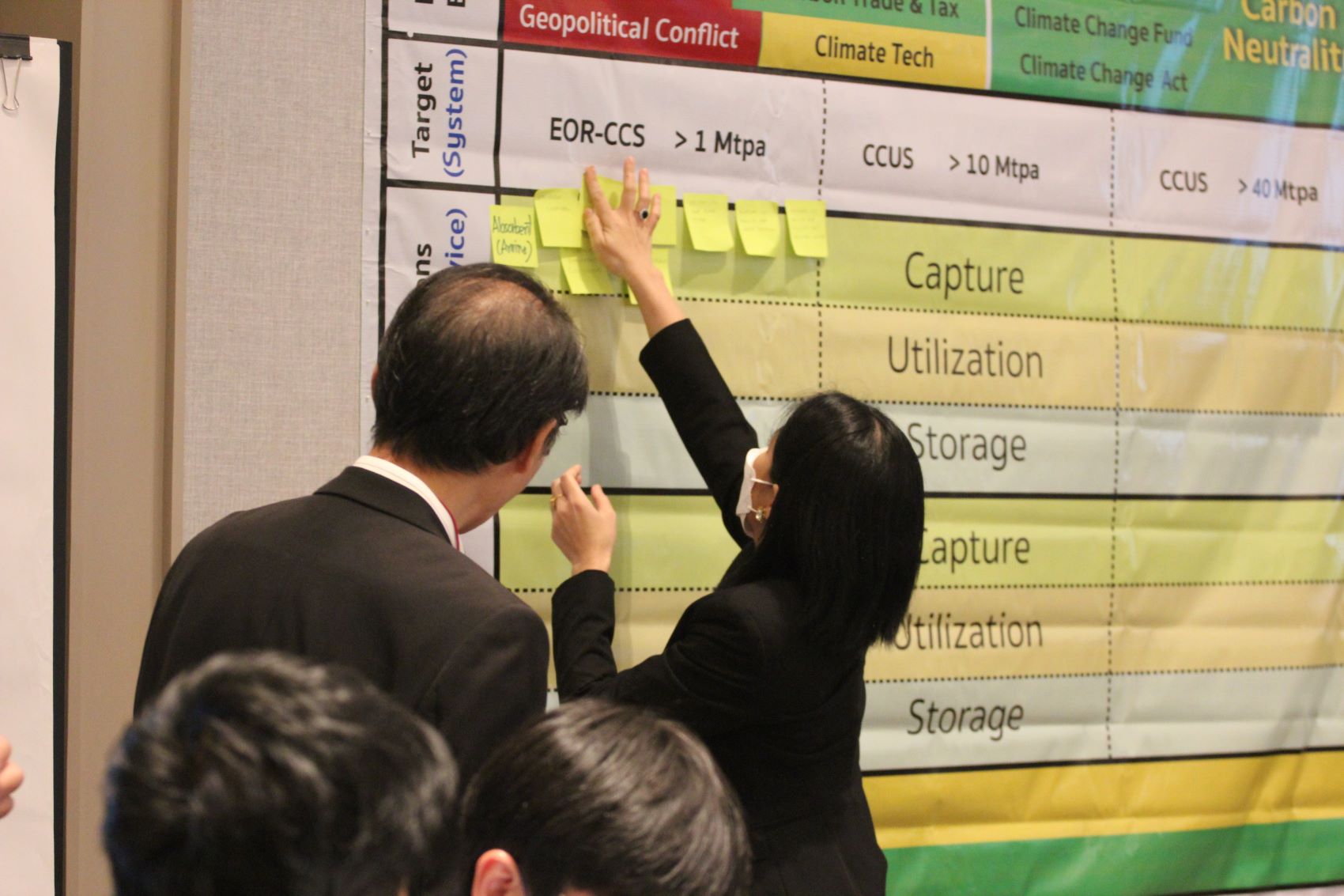 และกิจกรรมไฮไลท์ของงานที่สำคัญได้แก่ การระดมสมองเพื่อกำหนดเป้าหมายเชิงกลยุทธ์ของ CCUS TRM รวมทั้งการวิเคราะห์ application หรือการประยุกต์ใช้เทคโนโลยี CCUS และเป้าหมายปริมาณคาร์บอนที่คาดว่าจะจัดการได้ ตลอดจนการวิเคราะห์เทคโนโลยี CCUS ทั้ง CCS และ CCU ที่สามารถตอบความต้องการ application นั้นๆ ได้ ซึ่งช่วงกิจกรรมดังกล่าว นำโดย รศ.ดร.ณัฐสิทธิ์ เกิดศรี วิทยาลัยการจัดการ มหาวิทยาลัยมหิดล ผู้เชี่ยวชาญด้านการจัดทำ TRM และ ดร.สุธี ผู้เจริญชนะชัย รองผู้อำนวยการศูนย์นาโนเทคโนโลยีแห่งชาติ สวทช. ในฐานะผู้แทนคณะวิจัย