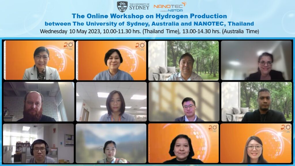 On 10 May 2023, NANOTEC, Thailand in collaboration with The University of Sydney, Australia organized the workshop on hydrogen production (virtual meeting). This is the kick-off activity between NANOTEC and The University of Sydney with an aim to bring together Australian and Thai professors and researchers to learn and share research experiences on “hydrogen production”.
