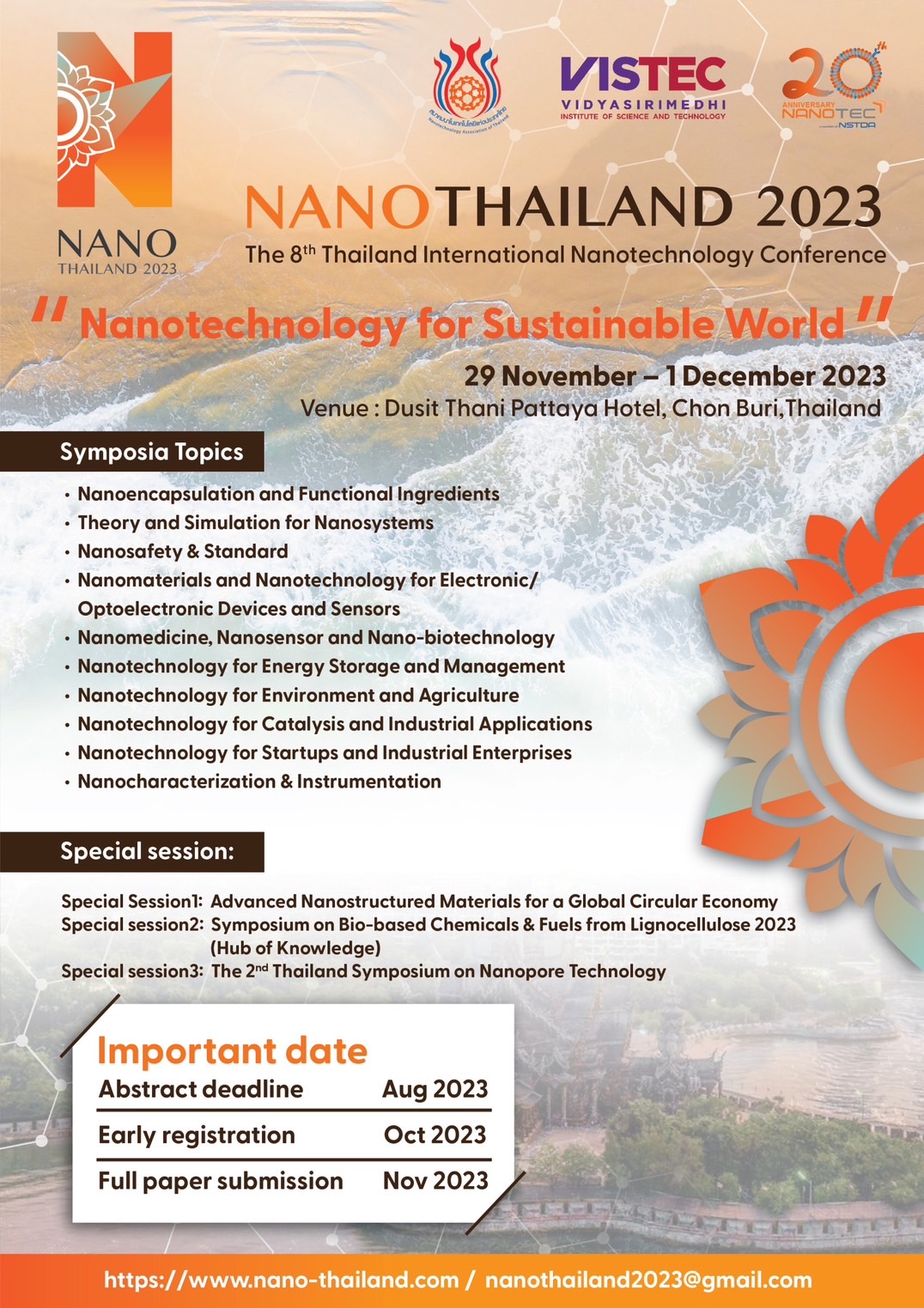 สมาคมนาโนเทคโนโลยีแห่งประเทศไทยร่วมกับ VISTEC และศูนย์นาโนเทคฯ ขอเชิญชวนนักวิจัย คณาจารย์ นิสิต นักศึกษาและผู้สนใจงานวิจัยและนวัตกรรมด้านนาโนเทคโน โลยี เข้าร่วมงาน NANO THAILAND 2023 (ครั้งที่ 8) ระหว่างวันที่ 29 พ.ย. -1 ธันวาคม 2566 ณ โรงแรมดุสิตธานี พัทยา
