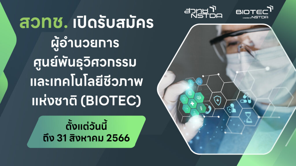 ในการนี้ สำนักงานพัฒนาวิทยาศาสตร์และเทคโนโลยีแห่งชาติ จึงใคร่เชิญชวนผู้มีคุณสมบัติเหมาะสม สมัครเข้ารับการคัดเลือกเป็นผู้อำนวยการศูนย์พันธุวิศวกรรมและเทคโนโลยีชีวภาพแห่งชาติ ตั้งแต่วันนี้ จนถึงวันที่ 31 สิงหาคม 2566