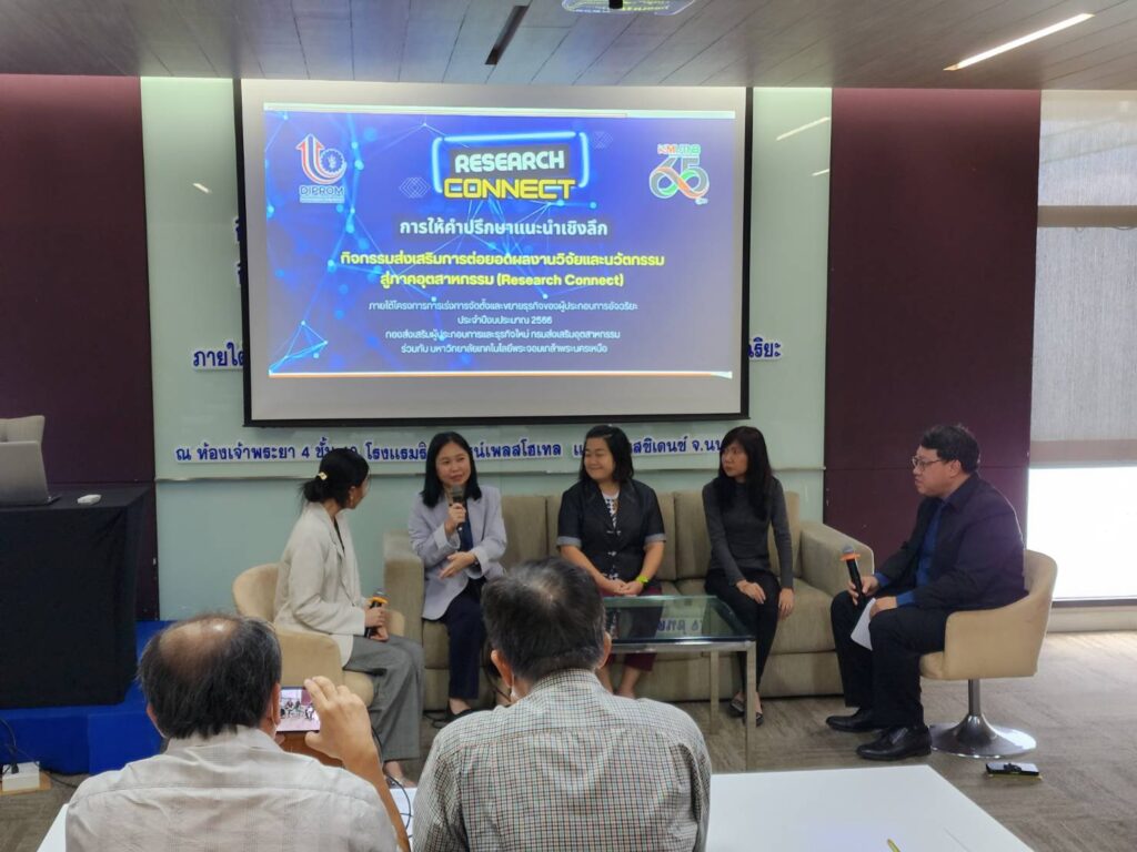 วันที่ 11 กันยายน 2566 ศูนย์นาโนเทคโนโลยีแห่งชาติ (นาโนเทค) สำนักงานพัฒนาวิทยาศาสตร์และเทคโนโลยีแห่งชาติ (สวทช.) นำโดย ดร.วีรกัญญา มณีประกรณ์ และ ดร.กันตพัฒน์ จันทร์แสนภักดิ์ ทีมวิจัยวัสดุตอบสนองระดับนาโน เข้าร่วมกิจกรรมสรุปผลการดำเนินงาน การให้คำปรึกษาเชิงลึก กิจกรรมส่งเสริมการต่อยอดผลงานวิจัยและนวัตกรรมสู่ภาคอุตสาหกรรม (Research Connect) ภายใต้โครงการการเร่งการจัดตั้งและขยายธุรกิจของผู้ประกอบการอัจฉริยะ ปีงบประมาณ 2566 จัดโดยกรมส่งเสริมอุตสาหกรรม ณ โรงแรมริเวอร์ไรน์เพลส โฮเทล แอนด์ เรสซิเดนซ์ จ.นนทบุรี ภายใต้กิจกรรมดังกล่าวมีผู้ประกอบการ นักประดิษฐ์ วิศวกร และนักวิจัยจากหน่วยงานต่างๆ ส่งผลงานนวัตกรรมเข้าร่วม รวม 19 ผลงาน และมีการคัดเลือก 15 ผลงานผ่านการคัดเลือก โดยมีผลงานที่ถูกคัดเลือกเป็น “Success case” เพื่อเข้าสู่กระบวนการส่งเสริมสู่การนำไปใช้ประโยชน์จริง จำนวน 4 ผลงาน โดยผลงานของนาโนเทค สวทช. ที่ส่งเข้าร่วม ได้แก่ “เซ็นเซอร์ตรวจวัดโลหะหนักในน้ำและพืชสมุนไพร” ได้รับคัดเลือกให้เป็น “success case” โดยมีผู้ประกอบการที่ให้ความสนใจในนวัตกรรมดังกล่าว จำนวน 2 ราย คือ บริษัท วิสดอม เชนโซลูชั่น จำกัด และ บริษัท เคเอส อะโกร จำกัด เพื่อนำมาพัฒนาและต่อยอดผลงานวิจัยและนวัตกรรมสู่การผลิตในภาคอุตสาหกรรม คาดการณ์แผนการลงทุน 3 ล้านบาท และมูลค่าเพิ่มจากการนำนวัตกรรมนี้ออกสู่ตลาด 6.5 ล้านบาท ตั้งเป้าในกลุ่มลูกค้าเป้าหมายทั้งแบบ B2B (บริษัทที่มีกระบวนการบำบัดน้ำเสีย การนิคมอุตสาหกรรม) และ B2G (การประปาส่วนภูมิภาค การไฟฟ้าฝ่ายผลิตแห่งประเทศไทย กรมอนามัย กรมควบคุมมลพิษ กรมส่งเสริมการปกครองส่วนท้องถิ่น)