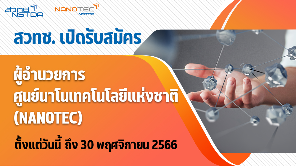 ในการนี้ สำนักงานพัฒนาวิทยาศาสตร์และเทคโนโลยีแห่งชาติ จึงใคร่เชิญชวนผู้มีคุณสมบัติเหมาะสม สมัครเข้ารับการคัดเลือกเป็นผู้อำนวยการศูนย์นาโนเทคโนโลยีแห่งชาติ ตั้งแต่วันนี้ จนถึงวันที่ 30 พฤศจิกายน 2566