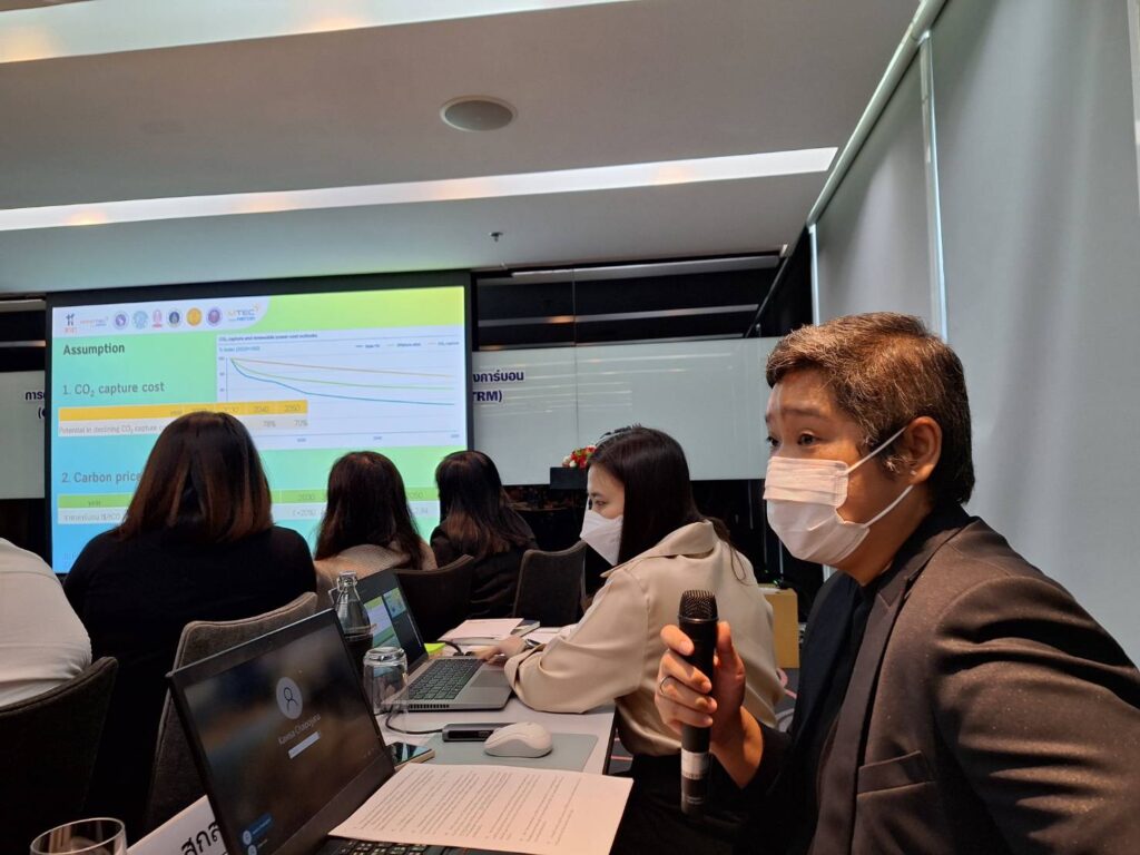 ภายในงาน ผู้แทนโครงการ CCUS TRM ประกอบด้วย ดร.วรรณี ฉินศิริกุล ผู้อำนวยการศูนย์นาโนเทค ในฐานะหัวหน้าโครงการ ร่วมด้วยคณะทำงาน ดร.ขจรศักดิ์ เฟื่องนวกิจ ผู้อำนวยการกลุ่มวิจัยการเร่งปฏิกิริยาและการคำนวณระดับนาโน ศูนย์นาโนเทค ผศ. ดร.สุพฤทธิ์ ตั้งพฤทธิ์กุล หัวหน้ากลุ่มวิจัยการดักจับและกักเก็บคาร์บอนไดออกไซด์เชียงใหม่ ม.เชียงใหม่ และ ดร.สายทิพย์ โสรัตน์ ฝ่ายพัฒนาธุรกิจ ศูนย์เทคโนโลยีโลหะและวัสดุแห่งชาติ (เอ็มเทค) สวทช. ได้ร่วมนำเสนอผลการดำเนินงาน CCUS TRM ทั้งในส่วนแผนที่นำทางเทคโนโลยี CCU และ CCS ตลอดจนผลการวิเคราะห์เชิงเศรษฐศาสตร์