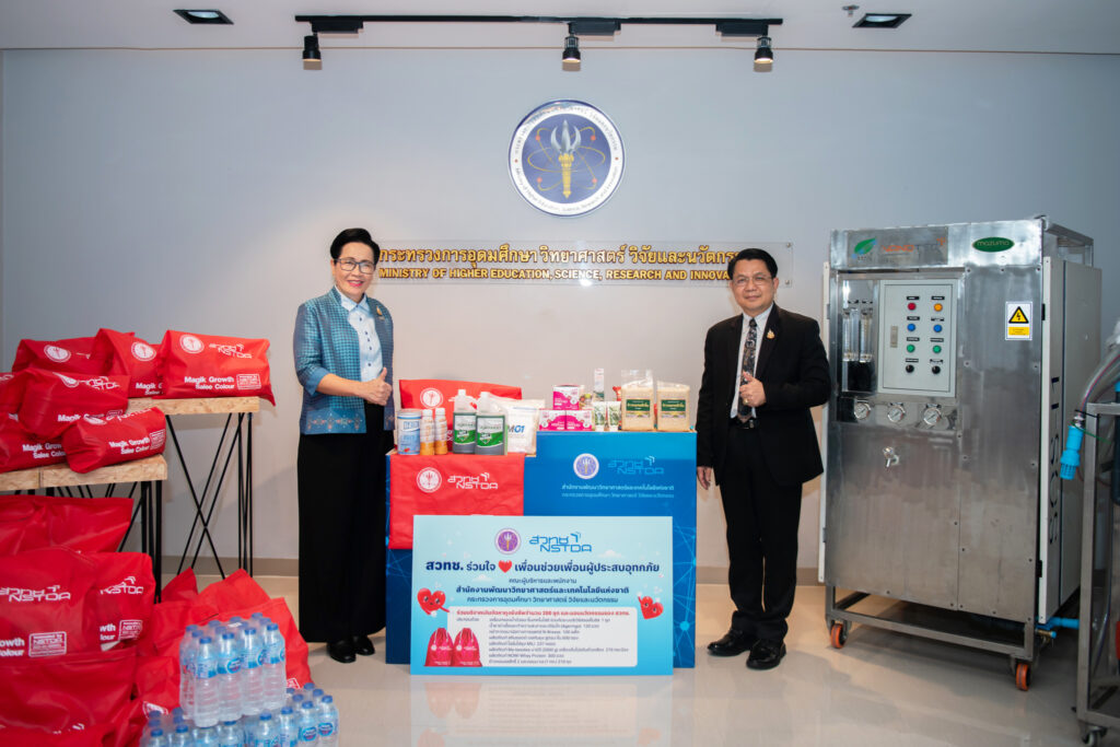 (วันที่ 6 กันยายน 2567) ณ ศูนย์ปฏิบัติการสถานการณ์น้ำท่วม “อว. เพื่อประชาชน” กระทรวงการอุดมศึกษา วิทยาศาสตร์ วิจัยและนวัตกรรม (อว.) : นายวันนี นนท์ศิริ ผู้ช่วยปลัดกระทรวง อว. รับมอบสิ่งของเครื่องอุปโภคบริโภคและนวัตกรรมวิจัยของ สวทช. และพันธมิตรภาคเอกชน ในโครงการ สวทช. รวมใจเพื่อนช่วยเพื่อนผู้ประสบอุทกภัย โดยมี ดร.จุฬารัตน์ ตันประเสริฐ รองผู้อำนวยการสำนักงานพัฒนาวิทยาศาสตร์และเทคโนโลยีแห่งชาติ (สวทช.) ปฏิบัติการแทนผู้อำนวยการ สวทช. เป็นตัวแทนคณะผู้บริหารและพนักงาน สวทช. มอบสิ่งของบริจาค ประกอบด้วย ถุงยังชีพจำนวน 200 ชุด ซึ่งภายในบรรจุอุปกรณ์และอาหารที่จำเป็นต่อการดำรงชีพเพื่อแจกจ่ายให้กับผู้ประสบอุทกภัยภาคเหนือ นอกจากนี้ได้มอบนวัตกรรมของ สวทช. และนวัตกรรมวิจัยที่ผลิตขึ้นในเชิงสาธารณะประโยชน์และที่ถ่ายทอดเทคโนโลยีในเชิงพาณิชย์ให้กับผู้ประกอบการภาคเอกชน