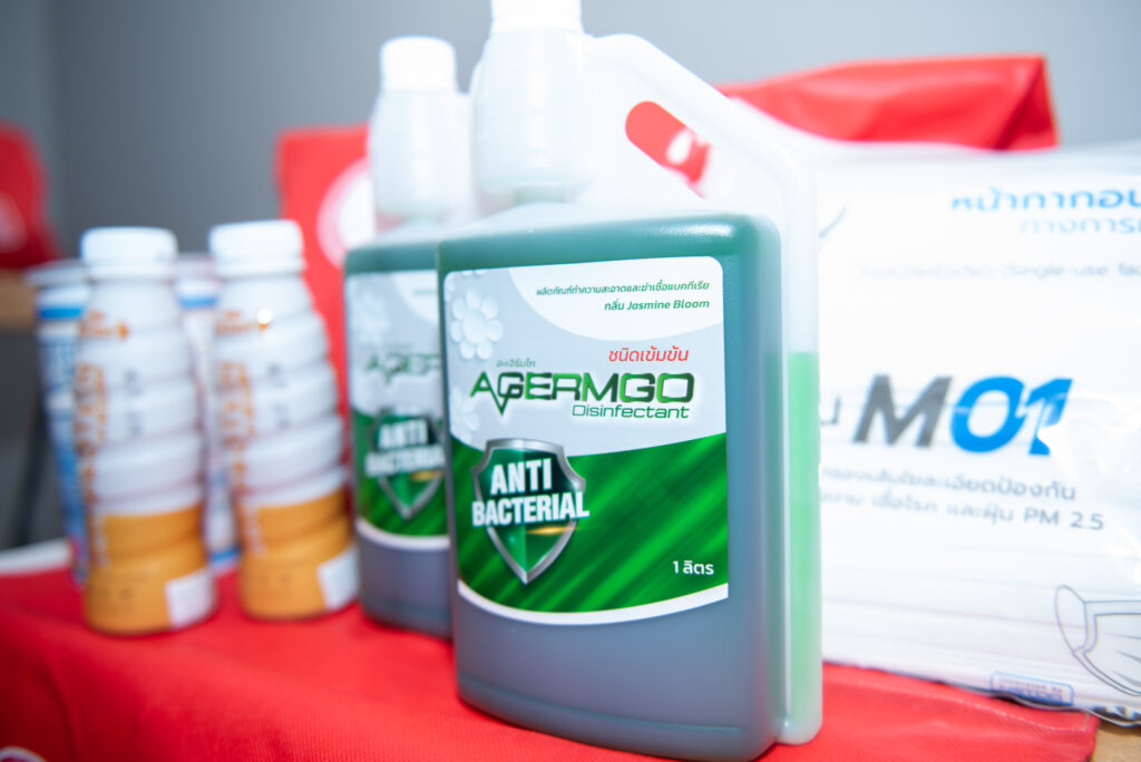 2.น้ำยาฆ่าเชื้อและทำความสะอาดสำหรับพื้นผิวอะเจิร์มโก (Agermgo) 120 ขวด ซึ่งเป็นผลิตภัณฑ์ฆ่าเชื้อชนิดเข้มข้น เป็น “น้ำยาฆ่าเชื้อโรคผสมซิงค์นาโนอิมัลชั่น” ซึ่งมีประสิทธิภาพในการฆ่าเชื้อที่ครอบคลุมสามารถทำลายเชื้อได้หลายชนิด ออกฤทธิ์เร็วและนาน ประกอบสารจากธรรมชาติกลุ่มกรดไขมันจากน้ำมันมะพร้าว