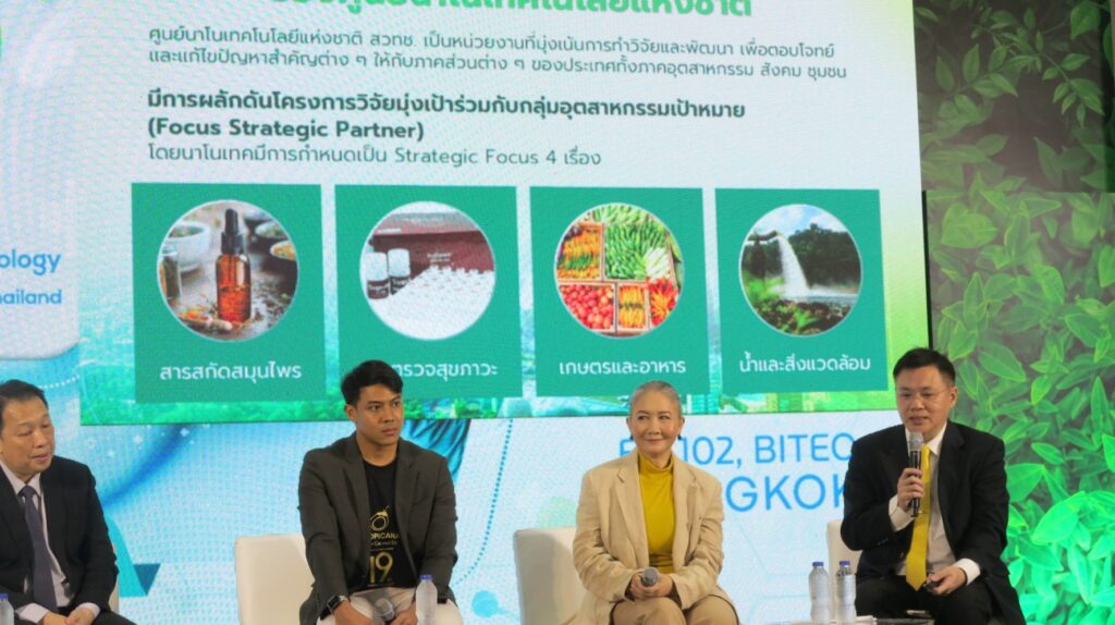 ดร. วิยงค์ กังวานศุภมงคล รองผู้อำนวยการ นาโนเทค สวทช. ร่วมเวทีเสวนา ” Green Transformation of Natural product Industry In Thailand” ซึ่งนำเสนอภาพของโมเดลเศรษฐกิจ BCG (เศรษฐกิจชีวภาพ หมุนเวียน และสีเขียว) ที่ผลักดันการใช้ประโยชน์จากจุดแข็งของประเทศในด้านความหลากหลายทางชีวภาพและความมั่งคั่งทางวัฒนธรรม และนำเทคโนโลยีและนวัตกรรมมาใช้เพื่อเปลี่ยนประเทศไทยให้เป็นเศรษฐกิจที่ขับเคลื่อนด้วยนวัตกรรมที่มีมูลค่าและยั่งยืน ซึ่งสอดรับกับทิศทางของนาโนเทคที่กำลังดำเนินการผ่านโครงการวิจัยมุ่งเป้าร่วมกับกลุ่มอุตสาหกรรมเป้าหมาย (Focus Strategic Partner) ที่กำหนดออกมาเป็น 4 Strategic Focus คือ สารสกัดสมุนไพร ชุดตรวจสุขภาวะ เกษตรและอาหาร และน้ำและสิ่งแวดล้อม ซึ่งล้วนเกี่ยวข้องกับ Green Industry หรืออุตสาหกรรมสีเขียวทั้งสิ้น