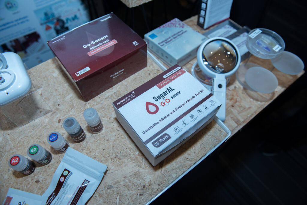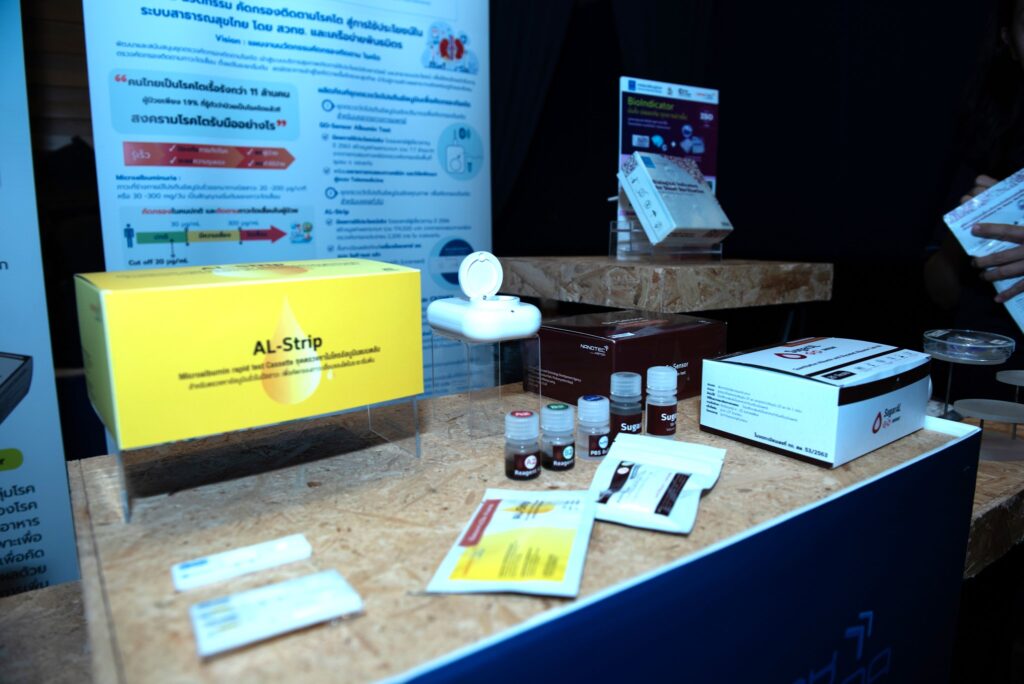 ด้านนาโนเทค สวทช. ได้ร่วมจัดนิทรรศการนำเสนอขีดความสามารถทางด้านการวิจัยและพัฒนาในกลุ่มของชุดตรวจเพื่อสุขภาพและการแพทย์ โดย ดร. ณัฐปภัสร วิริยะชัยพร ทีมวิจัยวัสดุตอบสนองระดับนาโน เป็นตัวแทนให้ข้อมูลเกี่ยวกับนวัตกรรมดังกล่าว ไม่ว่าจะเป็น ชุดตรวจติดตามเบาหวาน (SugarAL GO-SENSOR) ชุดตรวจโปรตีนอัลบูมินในปัสสาวะเชิงปริมาณ (GO-Sensor) ชุดตรวจโรคไตเชิงคุณภาพ (AL-Strips) ชุดตรวจสำหรับตรวจหาเชื้อไวรัสไข้หวัดใหญ่ (NanoFlu Rapid Test) ชุดตรวจเชื้อโควิด-19 แบบรวดเร็วชนิดการตรวจหาแอนติเจน (เทคนิค LFA) หรือ NANO Covid-19 Antigen Rapid Test รวมถึงชุดตรวจใช้แล้วทิ้งสำหรับทดสอบประสิทธิภาพการฆ่าเชื้อในหม้อนึ่งความดันไอน้ำ และยังมีนิทรรศการผลงานวิจัย FoodSERP แพลตฟอร์มให้บริการผลิตผลิตภัณฑ์อาหารฟังก์ชัน ผลิตภัณฑ์เวชสำอาง และผลิตภัณฑ์กลุ่มสารให้ประโยชน์เชิงหน้าที่ (Functional ingredient) ซึ่งได้รับความสนใจจากผู้เข้าเยี่ยมชม ที่มีแนวโน้มขยายสู่ความร่วมมือต่างๆ