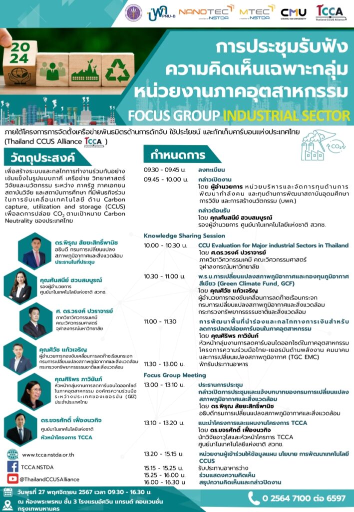 คณะทำงานโครงการ TCCAจากศูนย์นาโนเทคโนโลยีแห่งชาติ (นาโนเทค) สำนักงานพัฒนาวิทยาศาสตร์และเทคโนโลยีแห่งชาติ (สวทช.)จับมือกับเครือข่ายพันธมิตรฯ จัดทำการประชุมรับฟังความคิดเห็นเฉพาะกลุ่มหน่วยงานภาคอุตสาหกรรม (Focus Group Industrial Sector) ภายใต้การสนับสนุนของ หน่วยบริหารและจัดการทุนด้านการพัฒนากำลังคน และทุนด้านการพัฒนาสถาบันอุดมศึกษา การวิจัยและการสร้างนวัตกรรม (บพค.) ในวันพุธที่ 27 พฤศจิกายน 2567 เวลา 9.30 – 16.30 น. ณ ห้องพระพรหม ชั้น 3 โรงแรมอัศวิน แกรนด์ คอนเวนชั่น กรุงเทพมหานคร