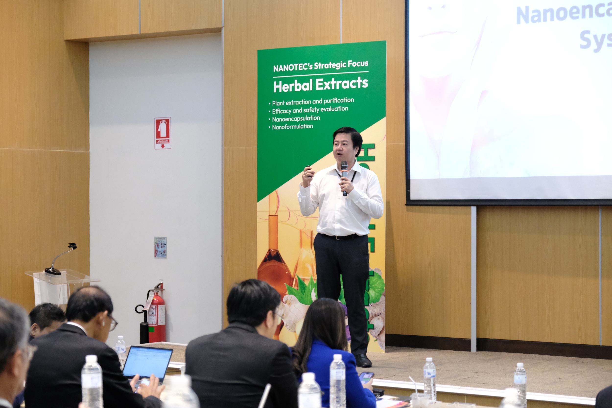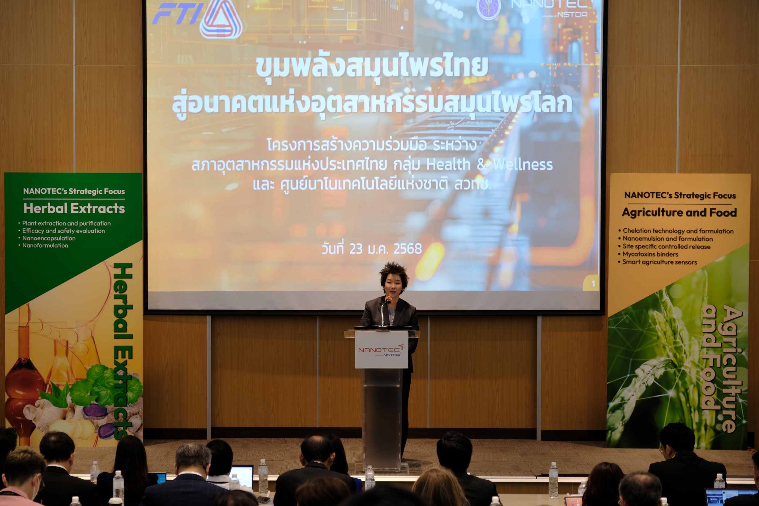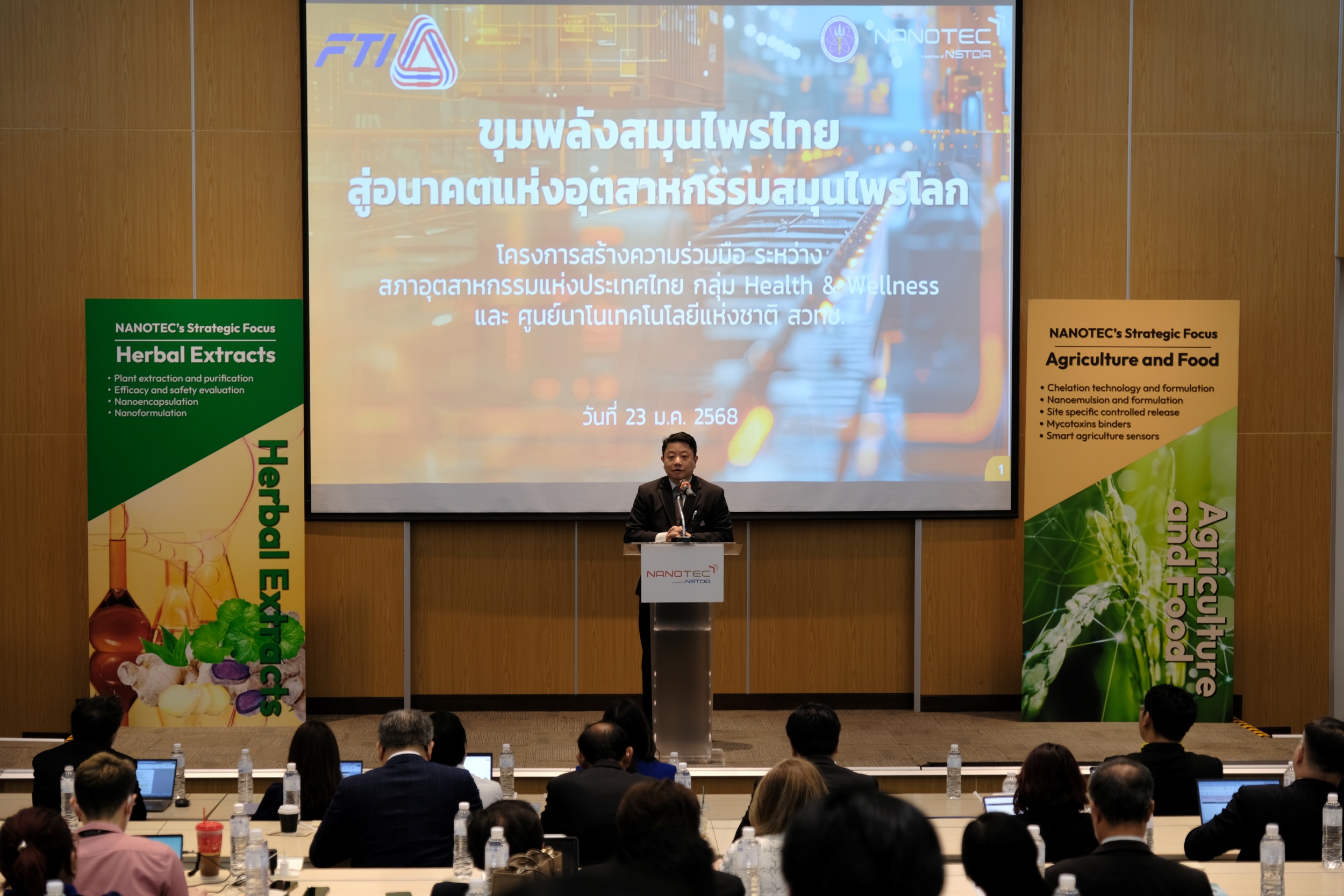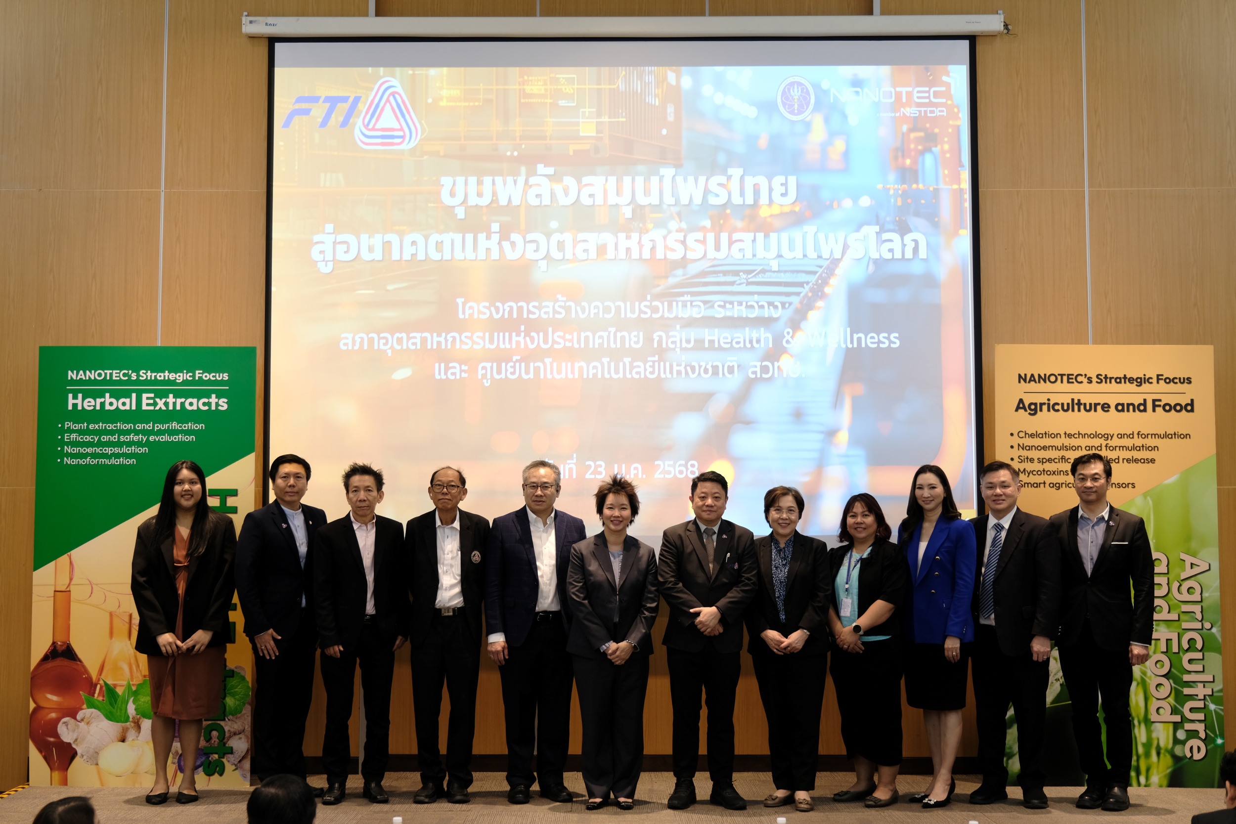 วันที่ 23 มกราคม 2568 ณ อุทยานวิทยาศาสตร์ประเทศไทย ปทุมธานี - ดร. อุรชา รักษ์ตานนท์ชัย ผู้อำนวยการศูนย์นาโนเทคโนโลยีแห่งชาติ (นาโนเทค) สำนักงานพัฒนาวิทยาศาสตร์และเทคโนโลยีแห่งชาติ (สวทช.) พร้อมด้วยดร. วิยงค์ กังวานศุภมงคล รองผู้อำนวยการนาโนเทค ดร. ศิวพร มีจู สมิธ รักษาการรองผู้อำนวยการนาโนเทค และคุณศันสนีย์ ฮวบสมบูรณ์ รองผู้อำนวยการนาโนเทค พร้อมด้วยคณะนักวิจัยนาโนเทค ร่วมต้อนรับคณะจากสภาอุตสาหกรรมแห่งประเทศไทย ( ส.อ.ท.) กลุ่มอุตสาหกรรมสุขภาพและความงาม นำโดยคุณวิวรรธน์ เหมมณฑารพ รองประธาน ส.อ.ท. และ ประธานสถาบันนวัตกรรม พร้อมด้วยคุณนาคาญ์ ทวิชาวัฒน์ ประธานกรรมการคลัสเตอร์อุตสาหกรรมสุขภาพและความงาม ส.อ.ท. และสมาชิก ส.อ.ท. ที่เข้าร่วมงานขุมพลังสมุนไพรไทยสู่อนาคตแห่งอุตสาหกรรมสมุนไพรโลก ภายใต้โครงการสร้างความร่วมมือระหว่างสภาอุตสาหกรรมแห่งประเทศไทย กลุ่มอุตสาหกรรมสุขภาพและความงาม และนาโนเทค สวทช. พร้อมรับฟังการนำเสนอศักยภาพด้านการวิจัยและพัฒนาที่เกี่ยวข้องกับอุตสาหกรรมสุขภาพและความงาม อาทิ สารสกัดกระชายดำ และอนุภาคกักเก็บสารสำคัญจากกระชายดำที่พร้อมอนุญาตสิทธิใช้ประโยชน์ผลงานวิจัยให้กลุ่มสมาชิก ส.อ.ท. และกระบวนการสกัดสารสกัดที่น่าสนใจสำหรับผลิตภัณฑ์เสริมอาหารและอาหาร/เครื่องดื่ม อาทิ สารสกัดเห็ดหลินจือ, สารสกัดจากดอกดาวเรือง, สารสกัดจากน้ำมันฟักข้าว นอกจากนี้ ยังมีการนำเสนอข้อมูลโรงงานต้นแบบผลิตอนุภาคนาโน เพื่อผลิตภัณฑ์อาหารและเสริมอาหาร, บริการวิเคราะห์ทดสอบประสิทธิภาพและความปลอดภัย และกรณีศึกษาเรื่อง ความสำเร็จจากห้องปฏิบัติการสู่ผู้ประกอบการ บริษัท โครโนไลฟ์ จำกัด ดีปเทคสตาร์ทอัพจากงานวิจัยของนาโนเทค สวทช. อีกด้วย