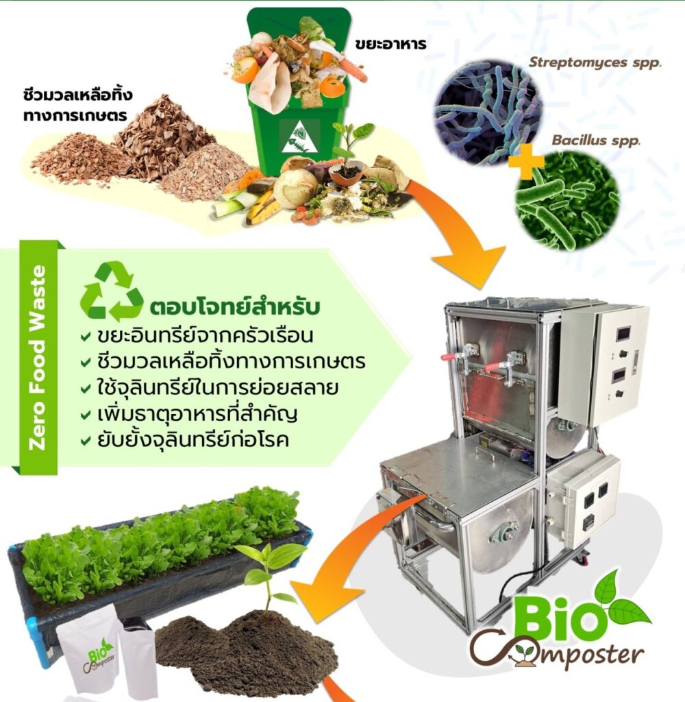 เครื่อง BioComposter ระบบถังคู่ ใช้สำหรับการทำปุ๋ยหมักชีวภาพระดับครัวเรือน ตอบโจทย์สำหรับขยะอินทรีย์ ทั้งเศษอาหารจากครัวเรือน รวมถึงชีวมวลเหลือทิ้งทางการเกษตร โดยทีมวิจัยนาโนเทค สวทช. ออกแบบตัวเครื่องระบบถังคู่ที่ถังหลัก (Primary Tank) ทำหน้าที่ควบคุมอุณหภูมิและความชื้นให้เหมาะกับการทำงาน ของจุลินทรีย์ ในขณะที่ถังรอง (Secondary Tank) มีหน้าที่ลดความชื้นของปุ๋ยหมักชีวภาพให้เหมาะสำหรับการ นำไปใช้งาน นอกจากนี้ ยังร่วมมือกับทีมวิจัยจากศูนย์พันธุวิศวกรรมและเทคโนโลยีชีวภาพแห่งชาติ (ไบโอเทค) ในการพัฒนาหัวเชื้อจุลินทรีย์ที่มีความจำเพาะในการย่อยสลายขยะอินทรีย์ในประเทศไทย โดยช่วยให้ปุ๋ยหมักชีวภาพที่เป็นผลผลิตจากกระบวนการดังกล่าวนี้ มีธาตุอาหารที่สำคัญเพิ่มขึ้น และสามารถยับยั้งจุลินทรีย์ก่อโรคได้อีกด้วย