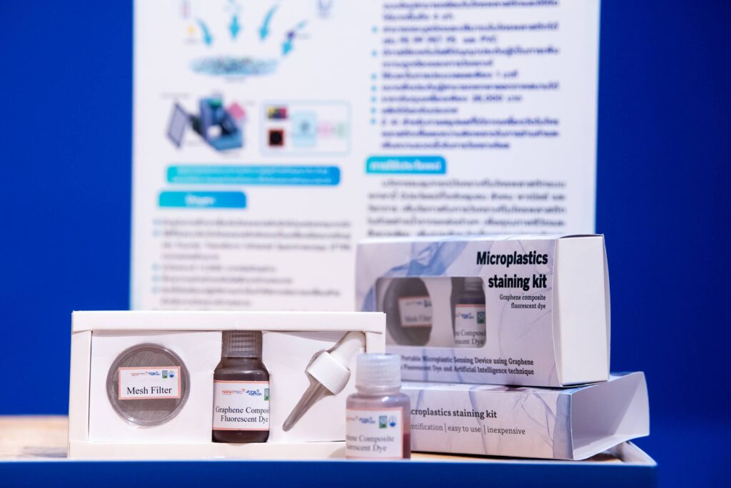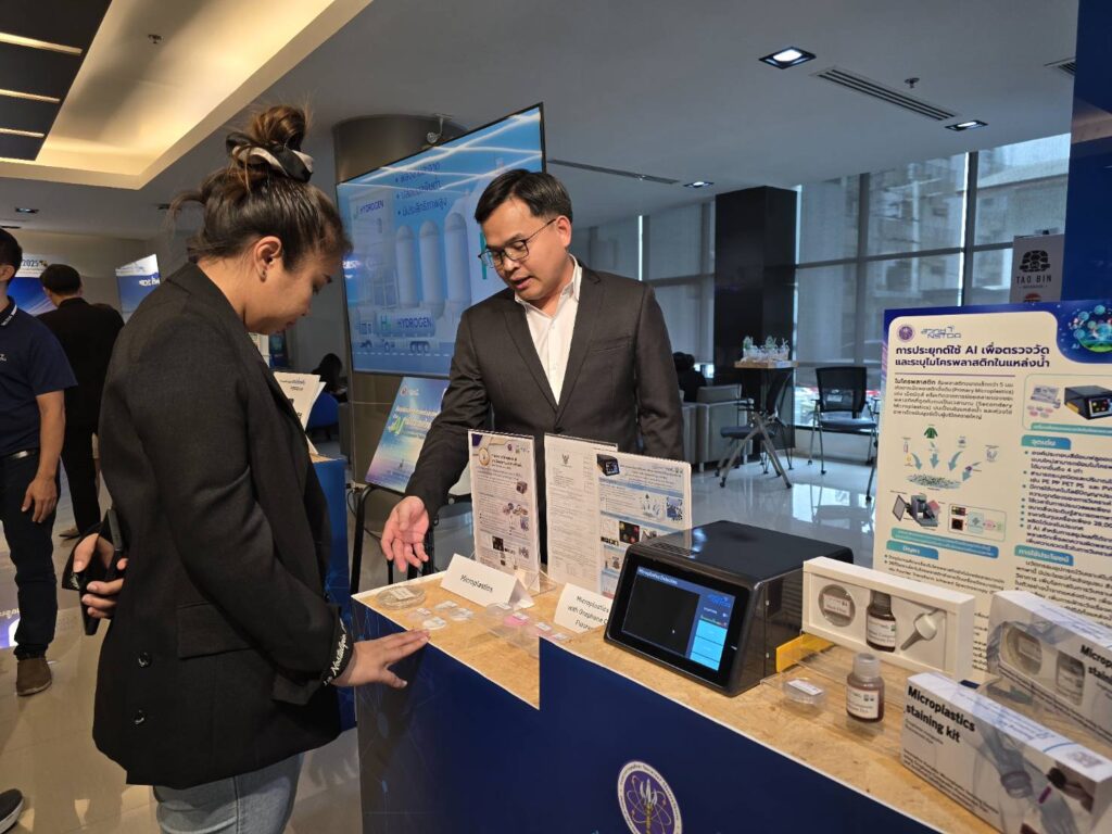 ภายในงานนี้ ศูนย์นาโนเทคโนโลยีแห่งชาติ (นาโนเทค) นำโดย ดร. อุรชา รักษ์ตานนท์ชัย ผู้อำนวยการศูนย์นาโนเทค พร้อมด้วย ดร.อัศวพงษ์ ทรัพย์พัฒน์, นายณัฐพล วัฒนวิสุทธิ์, น.ส. วิชญาพร คำสงฆ์ และนายวิศรุต พริ้มพราย จากทีมวิจัยกราฟีน (GRP) กลุ่มวิจัยวัสดุผสมและกระบวนการนาโน (HMNP) ร่วมงานแถลง พร้อมนำนวัตกรรม “การประยุกต์ใช้ AI เพื่อตรวจวัดและระบุไมโครพลาสติกในแหล่งน้ำ” มาร่วมจัดแสดง โดยนำเสนอนวัตกรรมตรวจวัดไมโครพลาสติกในแหล่งน้ำที่ประยุกต์ใช้เทคโนโลยี AI เพื่อเพิ่มความแม่นยำในการวิเคราะห์ ระบบสามารถจำแนกชนิดพลาสติก (PE, PP, PET, PS และ PVC) และปริมาณได้อย่างรวดเร็วภายใน 1 นาที ด้วยอุปกรณ์แบบพกพาราคาประหยัด ทำให้การติดตามตรวจสอบไมโครพลาสติกในแหล่งน้ำต่างๆ มีประสิทธิภาพและความแม่นยำสูงขึ้น พร้อมเป็นนวัตกรรมไทยราคาเอื้อมถึง สามารถทดแทนเทคโนโลยีต่างชาติในราคาสูง เกิดประโยชน์ทั้งเชิงชุมชน สังคม พาณิชย์ และวิชาการ เพิ่มโอกาสในการวิเคราะห์ไมโครพลาสติกในตัวอย่างน้ำจากแหล่งต่างๆ เพื่อคุณภาพชีวิตและสิ่งแวดล้อม เพิ่มการเฝ้าระวังเรื่องความปลอดภัยและคุณภาพน้ำ ประยุกต์ใช้ได้ทั้งแหล่งน้ำจืด น้ำทะเล และน้ำกร่อย รวมไปถึงการนำข้อมูลไปแก้ปัญหาที่มาของขยะอย่างยั่งยืนได้