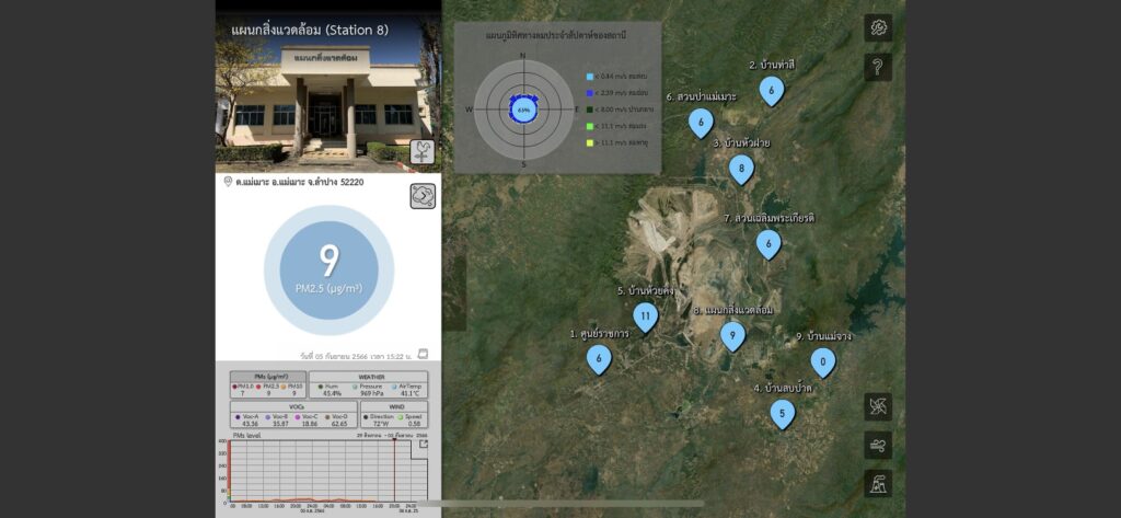 ทีมวิจัย สวทช. ติดตั้งเครื่องต้นแบบและเครื่องเก็บตัวอย่างฝุ่นละอองใน 9 บริเวณ ประกอบด้วยบ้านหัวฝาย, บ้านสบป้าด, ศูนย์ราชการอำเภอแม่เมาะ, บ้านห้วยคิง, แผนกสิ่งแวดล้อม กฟผ., บ้านแม่จาง, สวนเฉลิมพระเกียรติ แม่เมาะ, บ้านท่าสี และสวนป่าแม่เมาะ