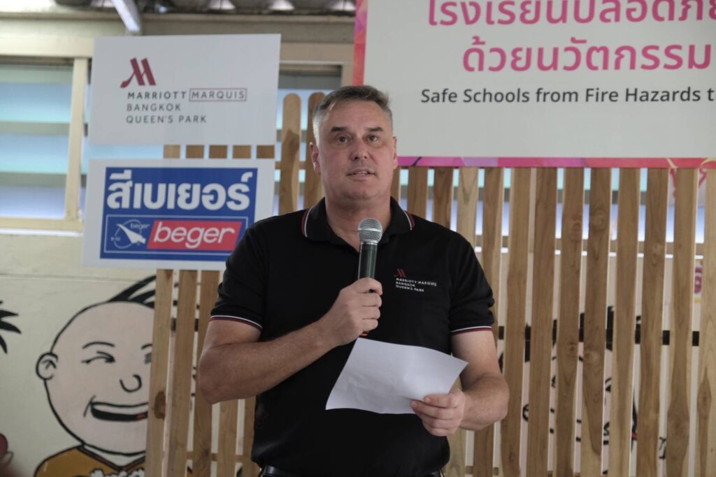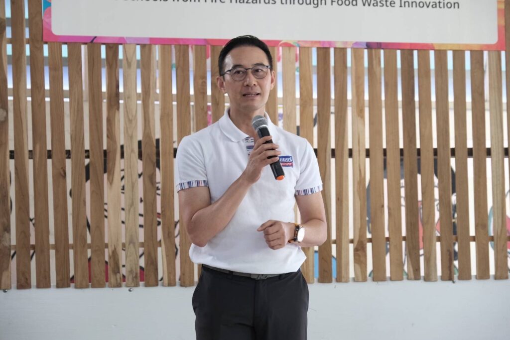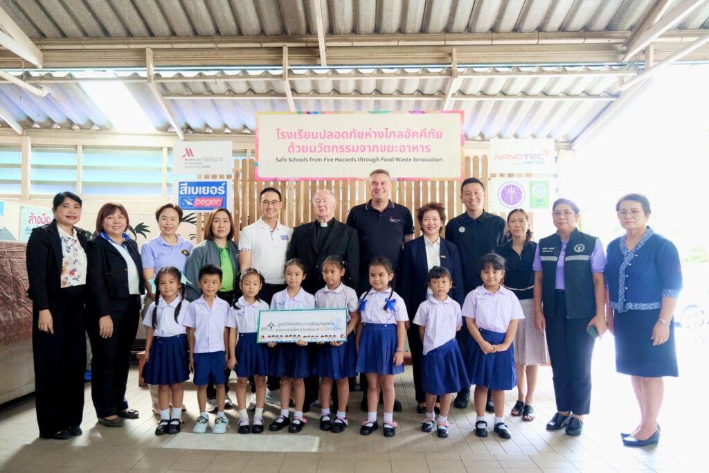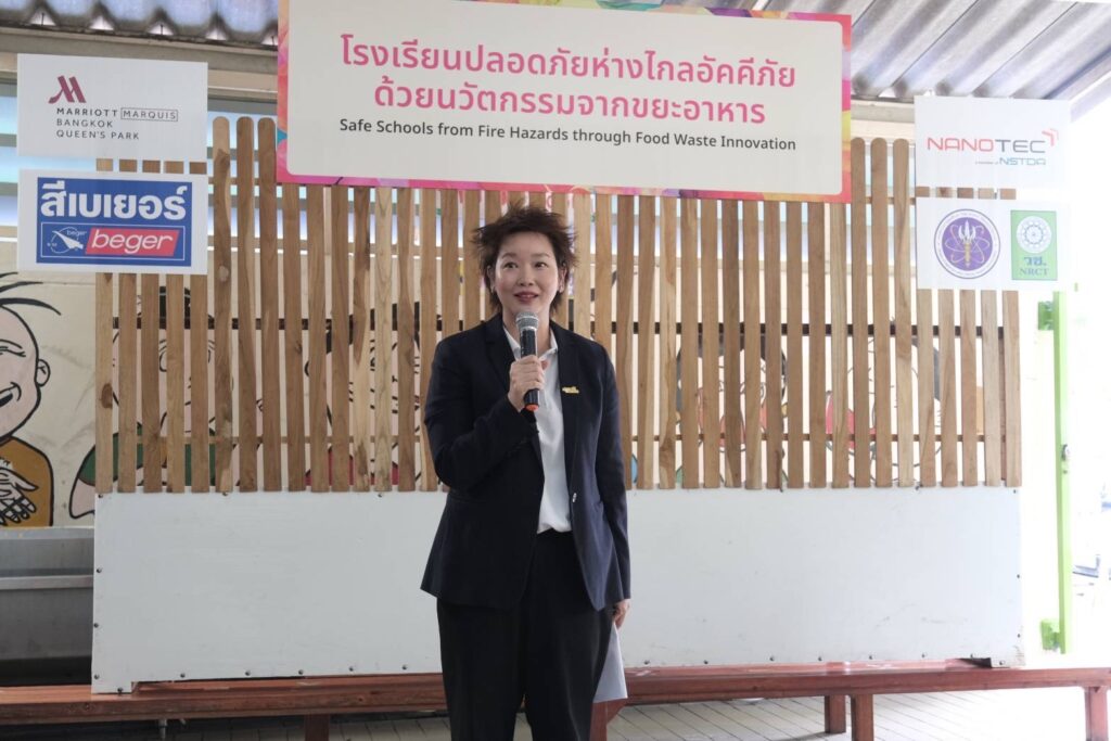 สำหรับโครงการ “โรงเรียนปลอดภัย ห่างไกลอัคคีภัยด้วยนวัตกรรมจากขยะอาหาร” เป็นการนำขยะอินทรีย์ของโรงแรมแบงค็อก แมริออท มาร์คีส์ ควีนส์ปาร์ค โดยเฉพาะเปลือกหอยนางรมเหลือทิ้งที่มีปริมาณมากถึง 1 ตันต่อเดือนจากห้องอาหารบุฟเฟ่ต์ โกจิ คิทเช่น และบาร์ มาร่วมวิจัยและพัฒนากับนาโนเทค สวทช. ในการพัฒนาเป็น “สารหน่วงไฟ” ที่ดสอบแล้วพบว่า มีสมบัติการหน่วงไฟตามมาตรฐาน UL94 V-0 ที่สามารถดับไฟได้เองภายใน 10 วินาที และไม่มีเปลวไฟหยด จากนั้น เกิดการต่อยอดกับพันธมิตรอย่างบริษัท เบเยอร์ จำกัดในการพัฒนา “สีหน่วงไฟ” ที่เหมาะสำหรับการทาภายในอาคาร โดยเฉพาะในชุมชนที่มีกลุ่มเปราะบาง ไม่ว่าจะเป็นเด็กเล็กหรือผู้สูงอายุ